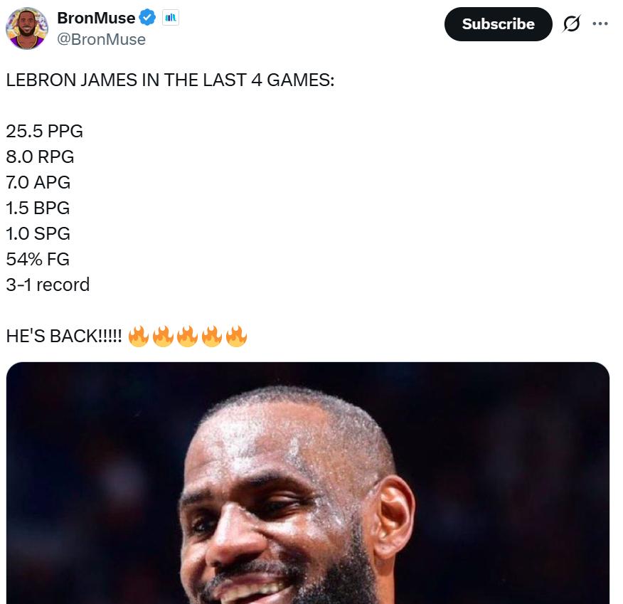 也讓開季至今整體數(shù)據(jù)提升至18.6分5.8籃板7.5助攻0.8搶斷0.7蓋帽,投籃命中率也回暖至46.9%,40歲老詹用行動證明他還能打。