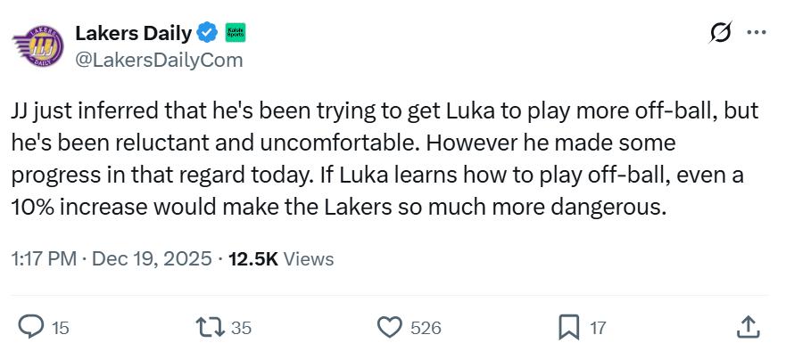 在沖擊MVP的同時,東契奇也在為球隊做出改變與犧牲,正如湖人自媒體Lakers Daily所說,雷迪克不止一次通過公開采訪暗示東契奇要打更多的無球,但后者一直不太情愿,本場他卻在這方面做得不錯,如果他愿意增加更多的無球跑動,哪怕是10%的提升,湖人的進(jìn)攻也會更具威脅。