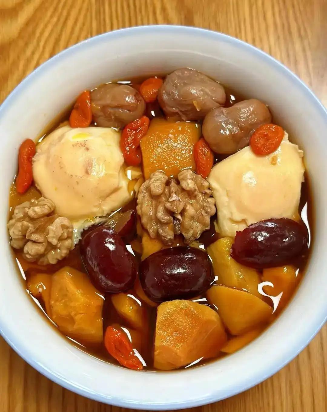 吃了扎實的羊肉,需要一碗甜湯來收尾。紅糖補血,桂圓安神,紅棗益氣,這三樣搭配,煮成一碗紅潤潤、甜絲絲的熱湯,專治手腳冰涼,喝完從心里往外冒熱氣。