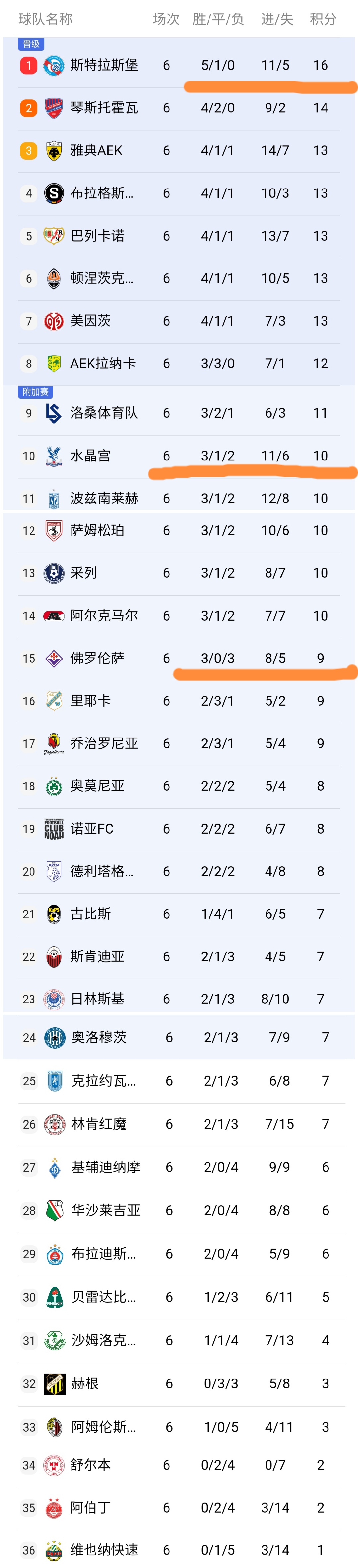 可以看到法甲排名第7的斯特拉斯堡隊積16分斬獲頭名,西甲球隊巴列卡諾、德甲副班長美因茨也都直接晉級淘汰賽。而英超第5的水晶宮要踢淘汰賽附加賽,佛羅倫薩也要踢淘汰賽附加賽。