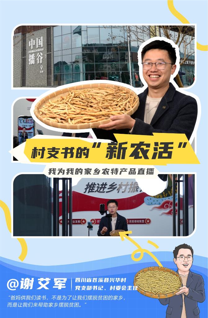 夜幕降臨,在“蒼溪支書助農工作室”,同為“90后”的興華村村支書謝艾軍,打開了他的直播間。近年來,他的網絡賬號“四川謝支書”在全網積累了近 20萬粉絲。他還組建“蒼溪支書助農團”,孵化帶動10余名本土主播。今年,他背著背簍唱山歌的視頻走紅網絡,讓更多人認識了蒼溪縣的“帶貨村支書”群體。