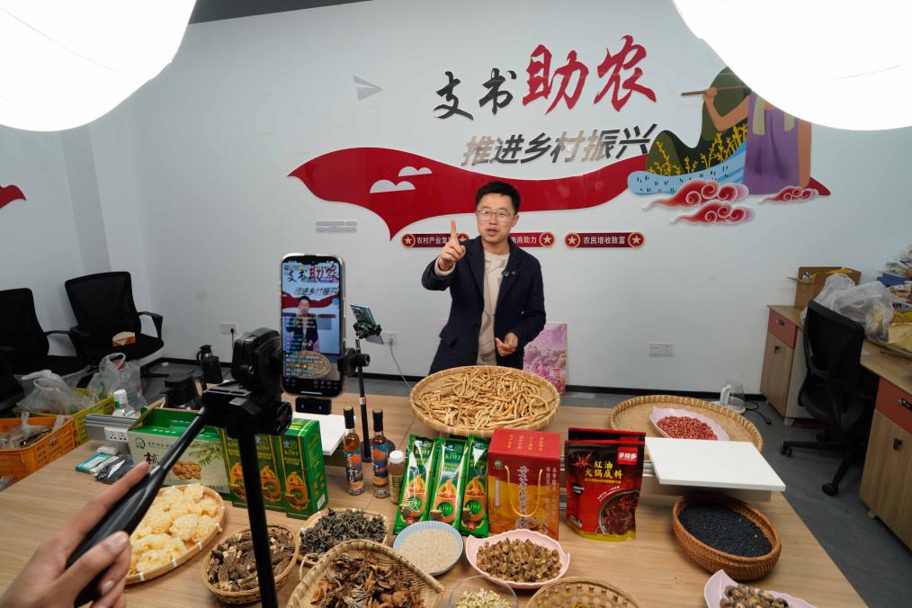12月12日,在四川省廣元市蒼溪縣“蒼溪支書助農工作室”,村支書謝艾軍進行助農直播。新華社記者 孫凡越 攝
