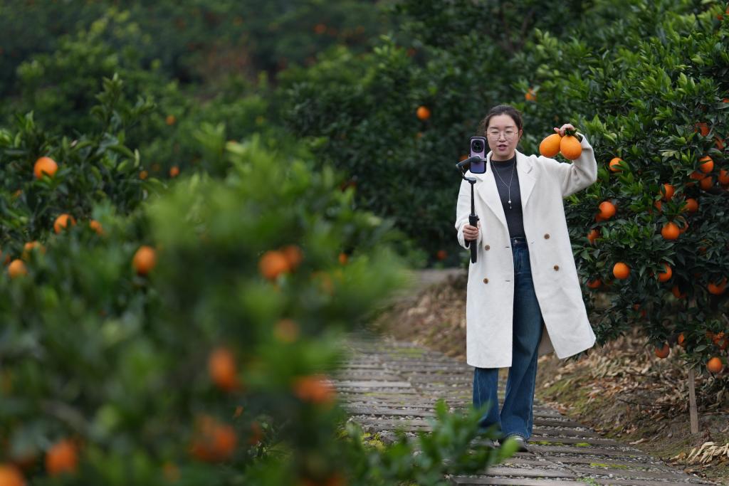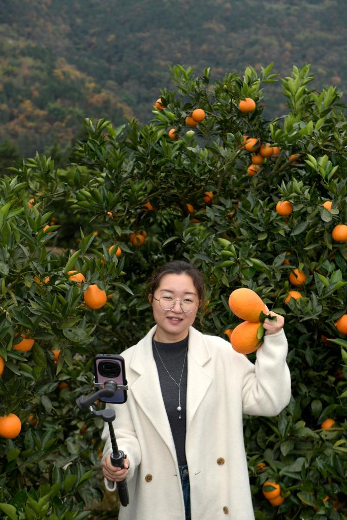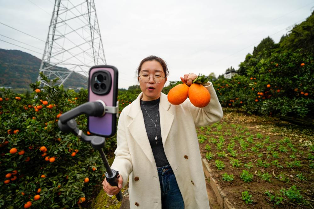 12月12日,在四川省廣元市蒼溪縣陵江鎮筍子溝村,村支書張桂華攜帶直播設備走在前往果園的路上。新華社記者 孫凡越 攝