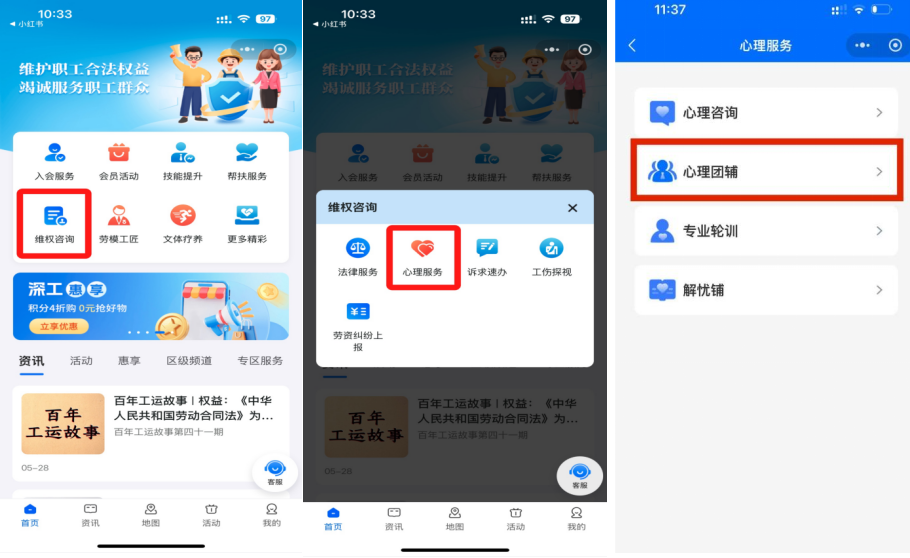 方式一:打開“深i工”小程序-點擊首頁“維權(quán)咨詢”-“心理服務(wù)”-“心理團(tuán)輔”-即可進(jìn)入搶課頁面。