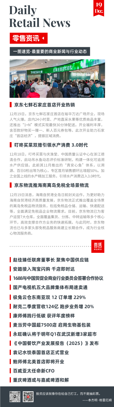 12月19日,石家莊裕華萬達廣場二層的京東七鮮超市正式開業(yè)。開業(yè)首日,現(xiàn)場人氣爆棚,客流如織。作為京東七鮮超市在石家莊的首店,藍鯊消費特地進行了實地探訪,而這次探店不僅是對一個零售項目的考察,更是對新消費時代價值重構(gòu)的解讀。