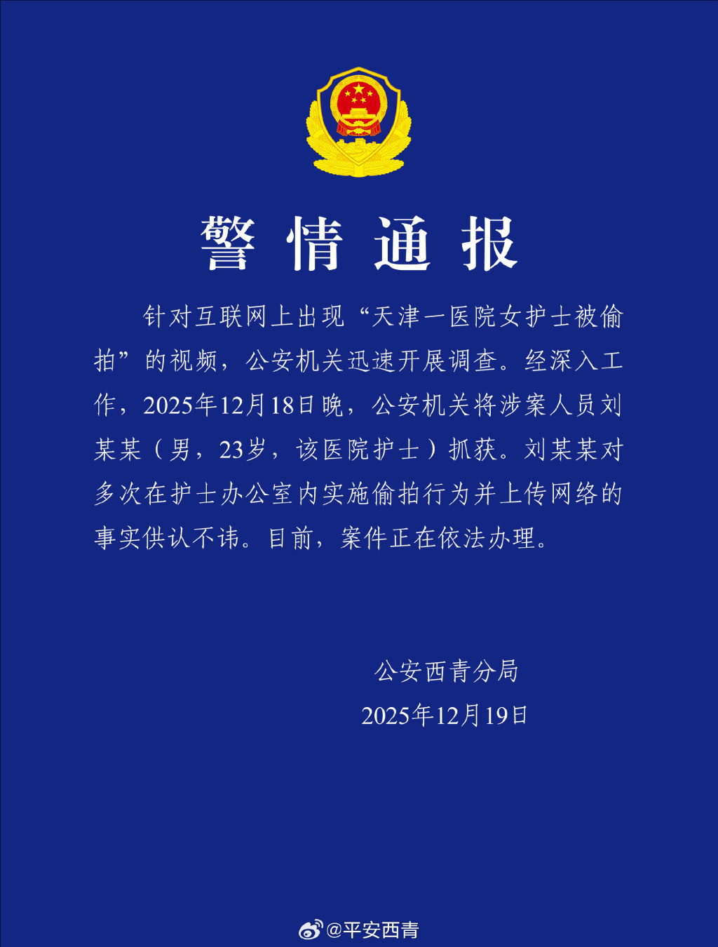 天津警方通報(bào)“一醫(yī)院女護(hù)士站更衣被偷拍”:劉某某(男,23歲,該醫(yī)院護(hù)士)已被抓獲