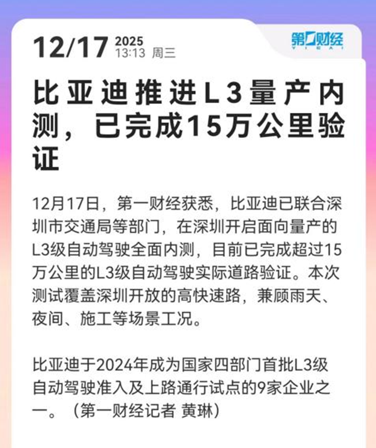 據相關報道,比亞迪聯合深圳市交通局等部門在深圳正式啟動面向量產的L3級自動駕駛全面內測,目前已完成超過15萬公里的實際道路驗證。這一消息不僅標志著比亞迪在高級別自動駕駛領域邁出關鍵一步,也為中國智能駕駛技術的規模化落地提供了重要的實踐樣本。