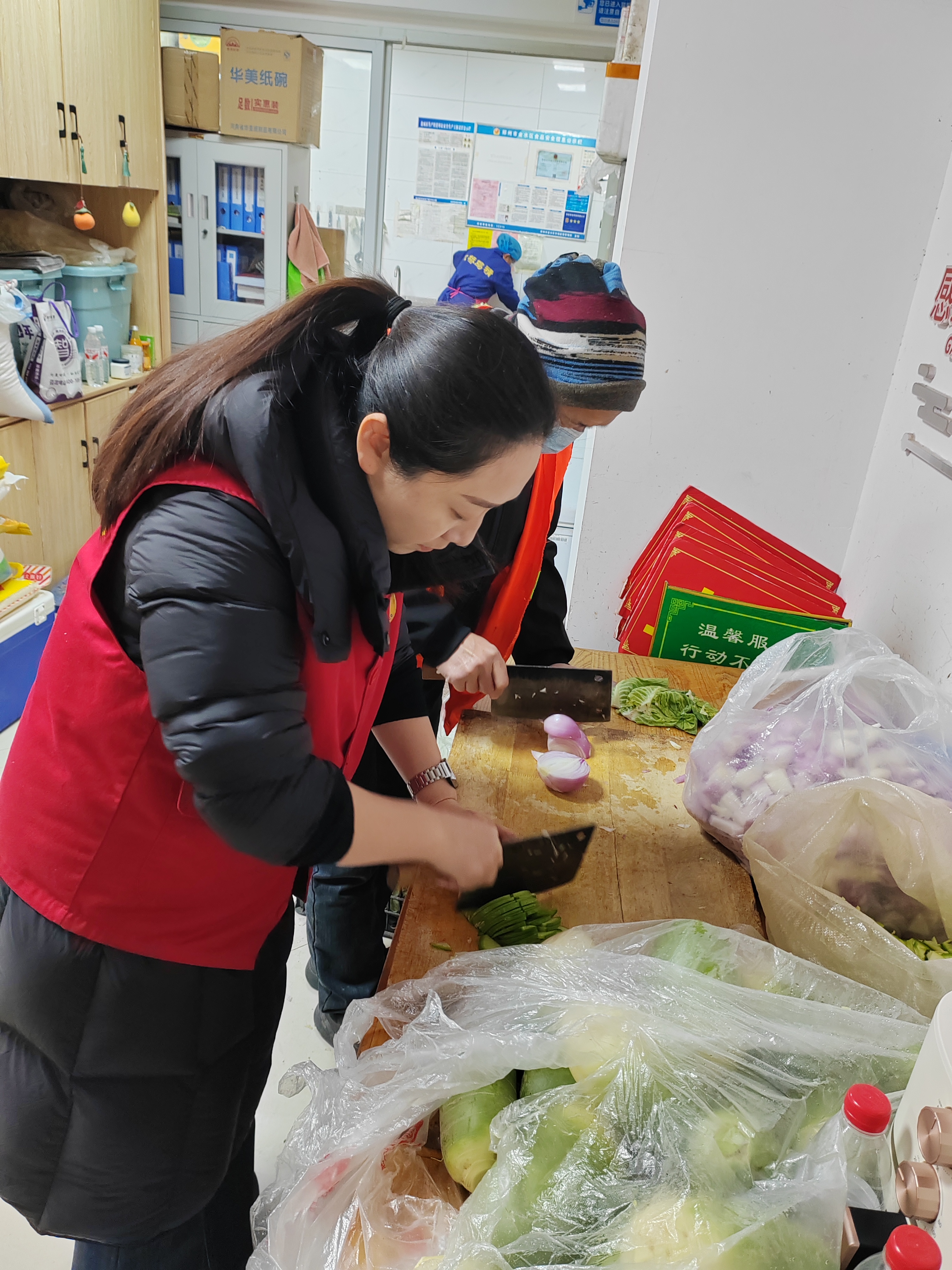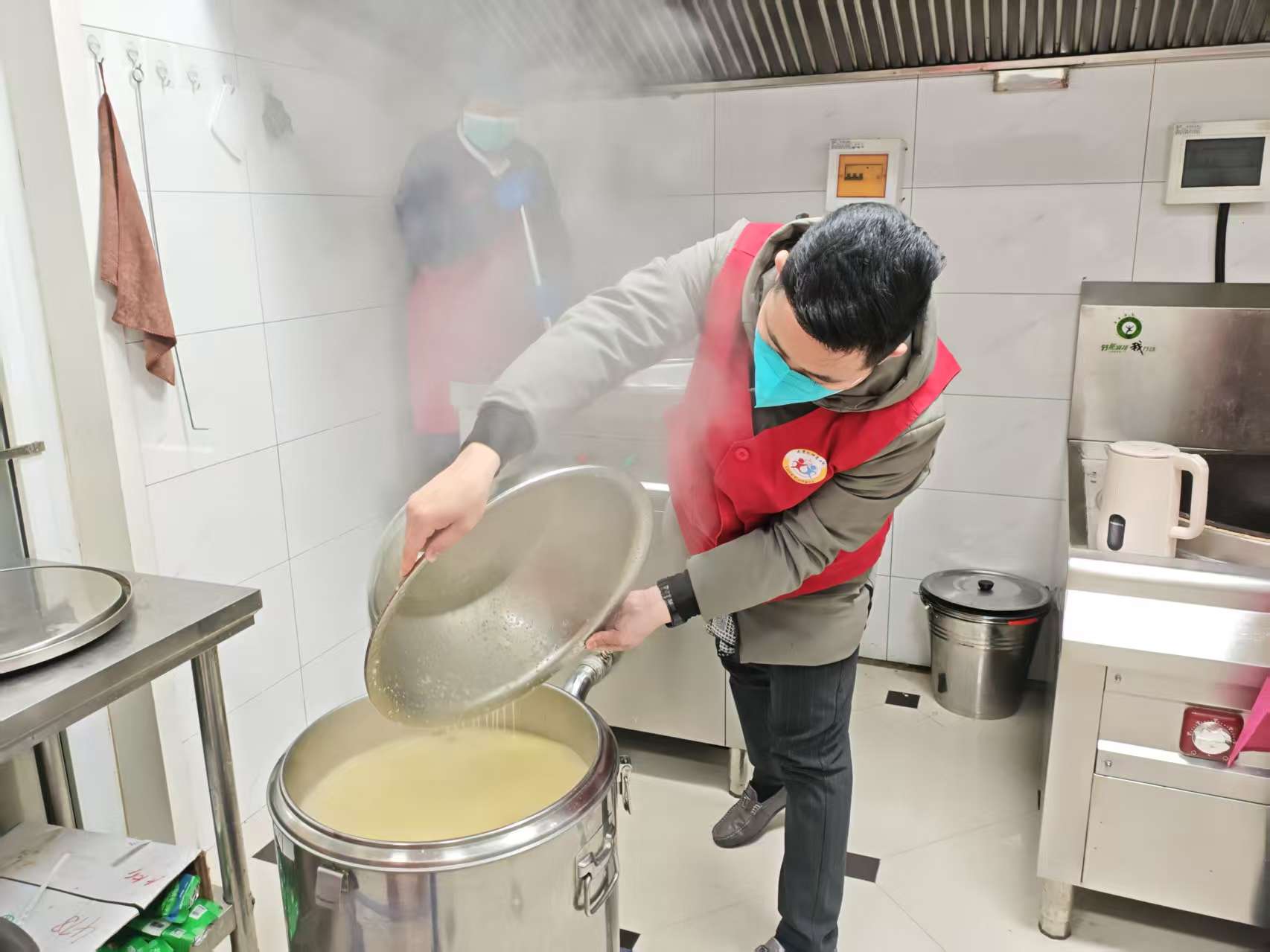 志愿者們分工協作、默契配合,擇菜、淘米、切配、熬煮,一系列操作有條不紊、細致規范。指尖翻飛間,新鮮食材蛻變為暖心餐食;蒸汽氤氳中,責任擔當融入每一份粥香。大家以嚴謹細致的態度對待每一道工序,用專業素養詮釋著 "健康守護者" 的初心,為后續餐食發放筑牢堅實基礎。