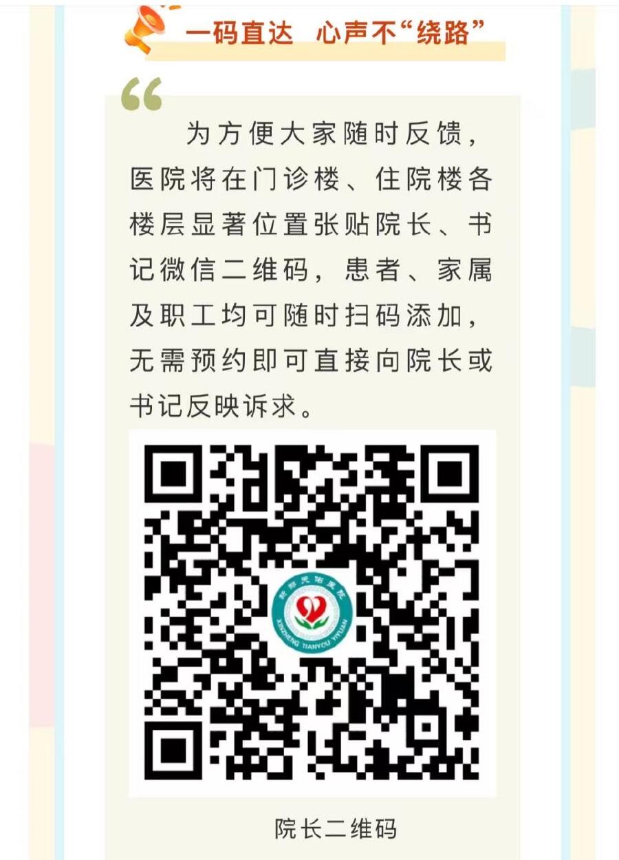 這是新鄭天佑醫院(原新鄭市第二人民醫院)院長微信的個性簽名,醫院在門診樓、住院樓各樓層顯著位置張貼出院長、書記的微信二維碼,患者、家屬及職工均可隨時掃碼添加,無須預約即可直接向院長或書記反映訴求。