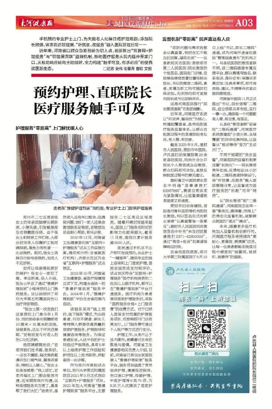 近年來,河南省以群眾急難愁盼為切入點,創新推出“互聯網+護理服務”與“管理層直聯”監督機制,推動醫療服務從院內延伸至家門口、從被動響應轉向主動傾聽,全力構建“觸手可及、有求必應”的便民就醫新生態。