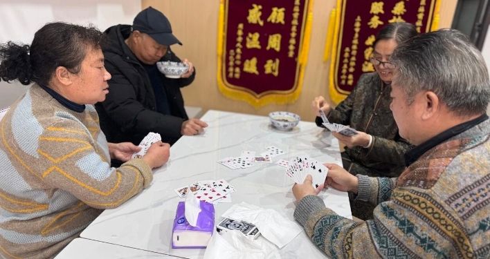 包餃子間隙,棋牌區也格外熱鬧。老人們圍坐一桌打撲克,出牌時認真思索,贏牌時開懷大笑,你來我往間滿是愜意。沒有忙碌的瑣事,只有老友相聚的舒心自在,簡單的娛樂里藏著最樸實的快樂。