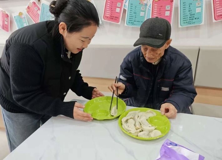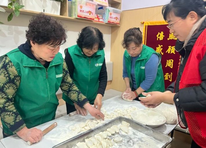 一大早,幸福食堂就熱鬧起來。老人們如約而至,圍坐在桌前分工協作,和面、搟皮、包餃子有條不紊。有的老人手法嫻熟,飛快捏出一個個飽滿的元寶餃;有的互相切磋技巧,手把手傳授經驗,歡聲笑語縈繞在食堂每個角落。一張張面皮裹著鮮香餡料,也裹著鄰里間的溫情與陪伴。