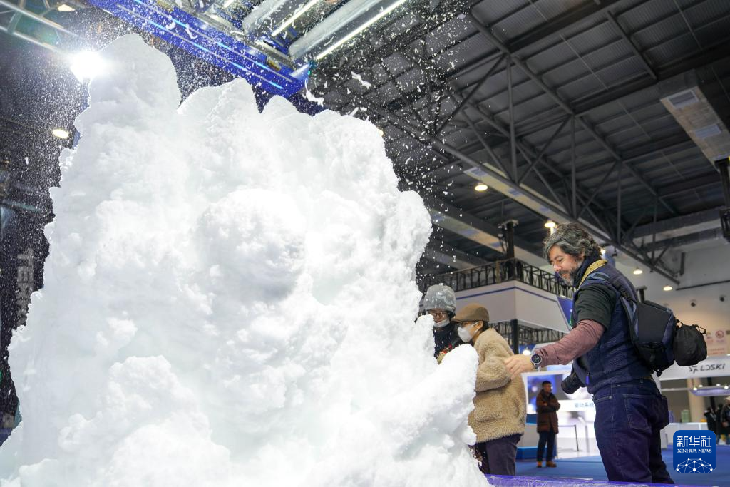 12月18日,外國媒體記者在第九屆吉林冰雪產業國際博覽會現場參觀中國制造的造雪機。