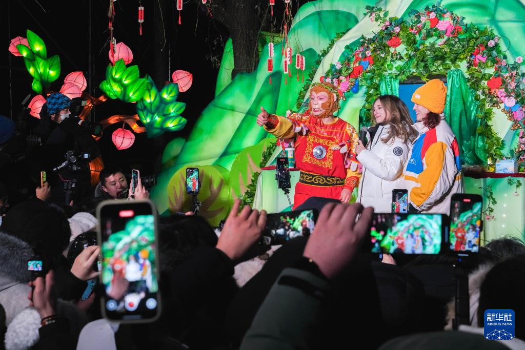 12月17日,外國媒體記者在長春市動植物公園與西游記主題表演演職人員進行互動。
