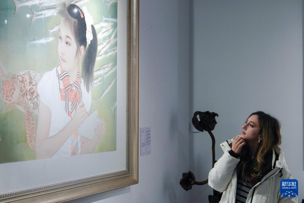 12月17日,外國媒體記者在長春市春京西歷史文化街區參觀吉林省首屆書畫名家作品展。
