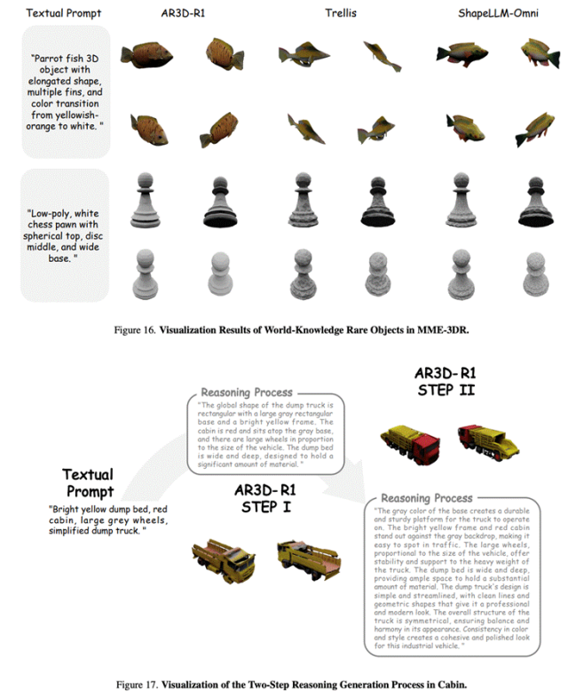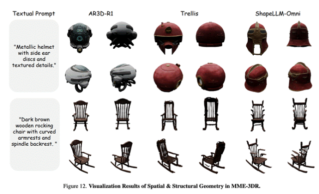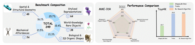 2)MME-3DR能同時評估隱式推理與通用3D生成能力。圖中柱狀圖顯示,在隨機采樣的Toys4K測試集上,Trellis明顯優于ShapeLLM-Omni。這一性能差距在MME-3DR中依然保持,進一步驗證了其多樣化物體覆蓋帶來的評測有效性。