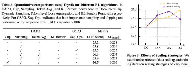 3)擴大量級的訓練數據能夠有效緩解偏好獎勵帶來的偏差并提升整體表現;適度增加RL迭代也能進一步優化模型,但過度訓練可能損害泛化能力。