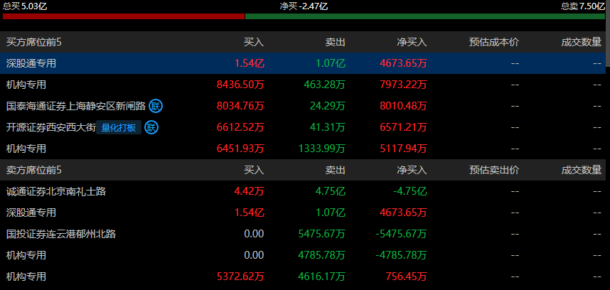航天智造(300446)今日漲16.30%,成交額41.32億元,換手率42.17%,盤后龍虎榜數據顯示,深股通專用席位買入1.54億元并賣出1.07億元,3家機構專用席位凈買入1.38億元,有1家機構專用席位凈賣出4785.78萬元。誠通證券北京南禮士路凈賣出4.75億元。