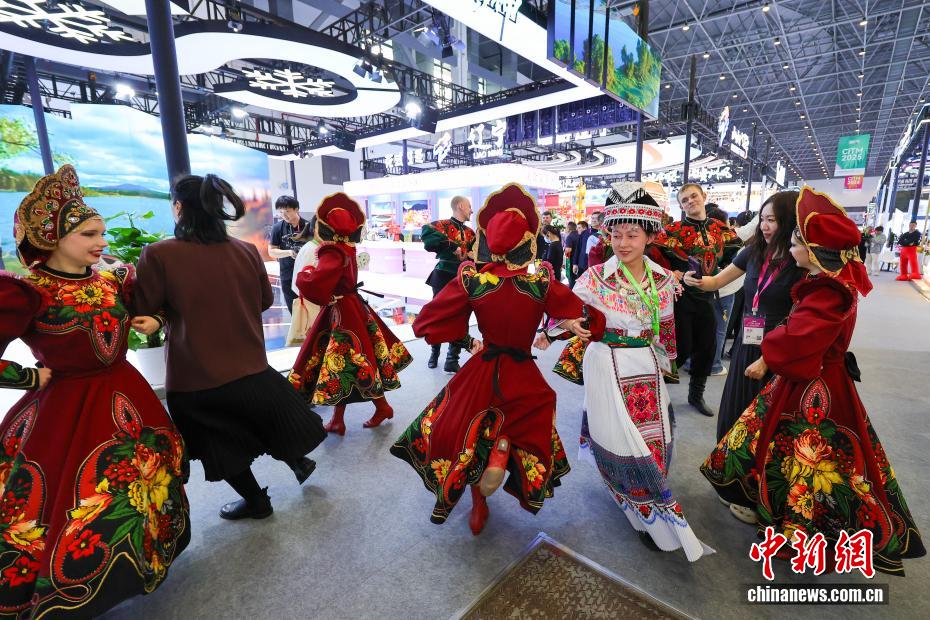 12月19日,黑龍江展館的外籍舞蹈演員與參觀者跳舞互動。當日,2025中國國際旅游交易會在海南??陂_幕。據了解,本屆旅交會以“你好!中國”為主題,展覽總面積6.5萬平方米,設置國內展區、國際展區、陽光海南展區、文旅融合展區、入境旅游消費展區等5個展區,吸引超過100個國家和地區的旅游機構、旅行商參展,計劃邀請1000名國際及港澳臺地區旅行商、300名國內參展單位及重點企業代表參會。