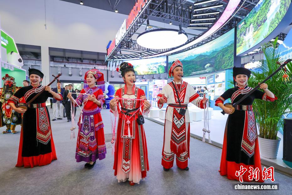 12月19日,廣西展館的演員表演特色山歌。當日,2025中國國際旅游交易會在海南??陂_幕。據了解,本屆旅交會以“你好!中國”為主題,展覽總面積6.5萬平方米,設置國內展區、國際展區、陽光海南展區、文旅融合展區、入境旅游消費展區等5個展區,吸引超過100個國家和地區的旅游機構、旅行商參展,計劃邀請1000名國際及港澳臺地區旅行商、300名國內參展單位及重點企業代表參會。