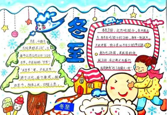 在“寫(xiě)冬至”活動(dòng)中,孩子們還以筆墨為載體,勾勒冬至文化畫(huà)卷。他們繪制的手抄報(bào)圖文并茂,黑板報(bào)設(shè)計(jì)匠心獨(dú)運(yùn),一筆一畫(huà)勾勒出節(jié)氣的物候美景與民俗畫(huà)卷。方寸筆墨流動(dòng)著對(duì)傳統(tǒng)文化的理解與熱愛(ài),也彰顯了孩子們發(fā)現(xiàn)美、創(chuàng)造美的能力。
