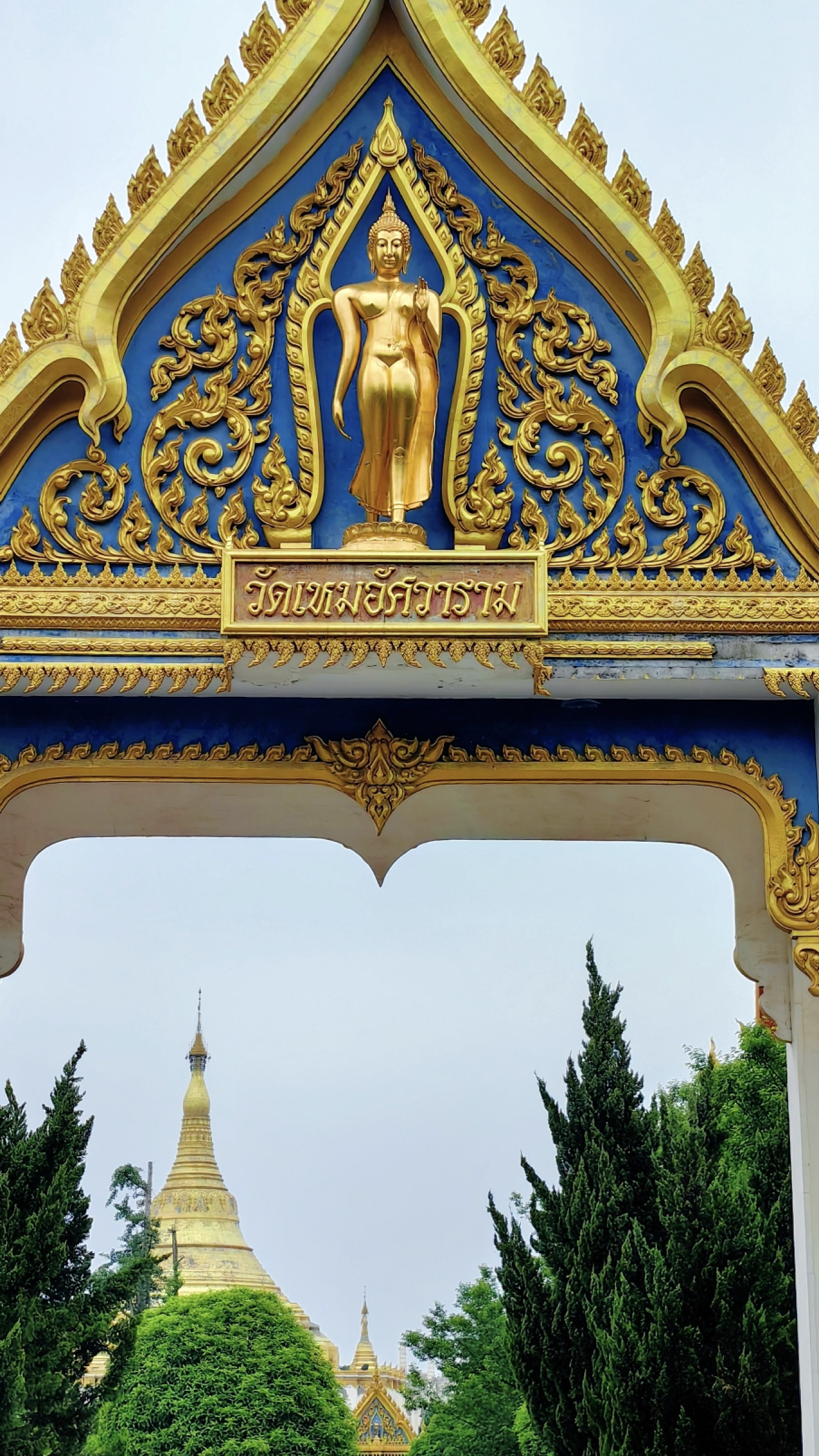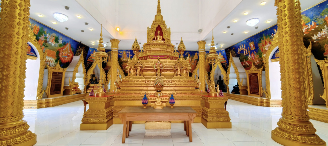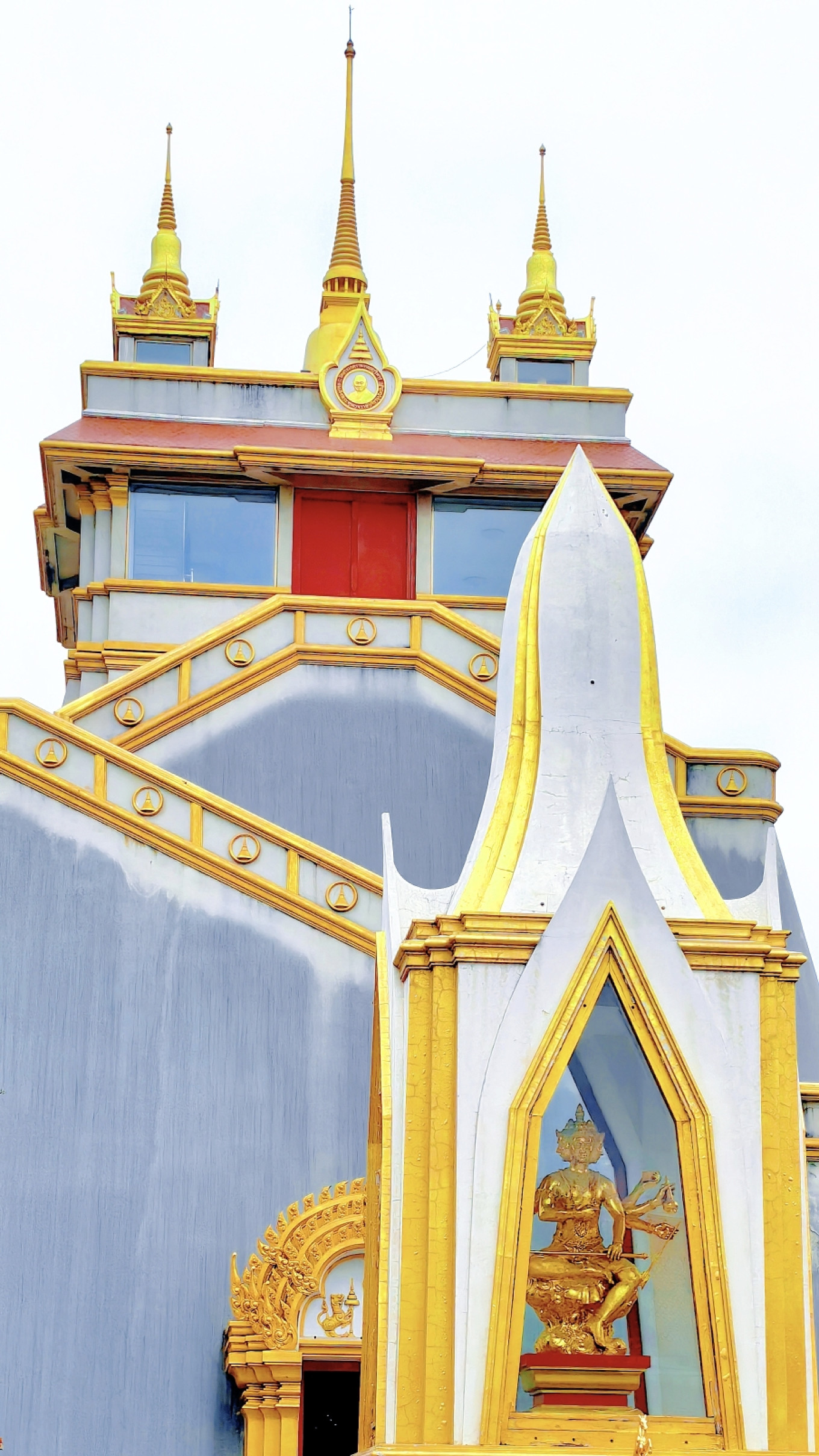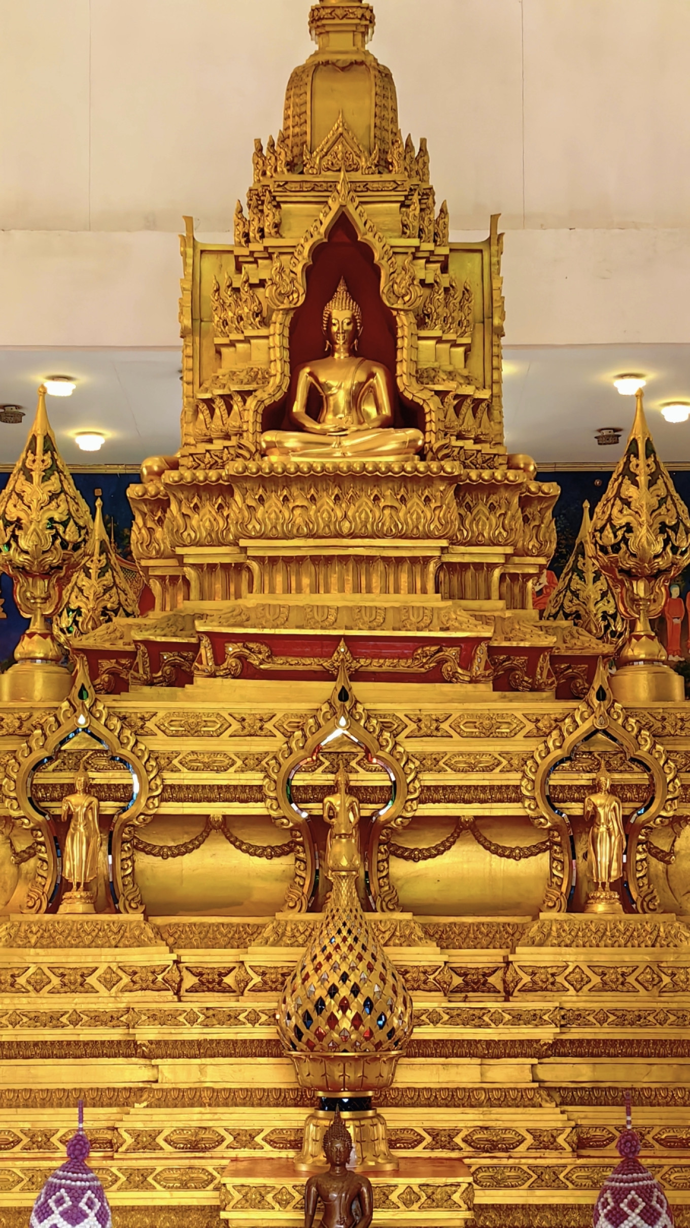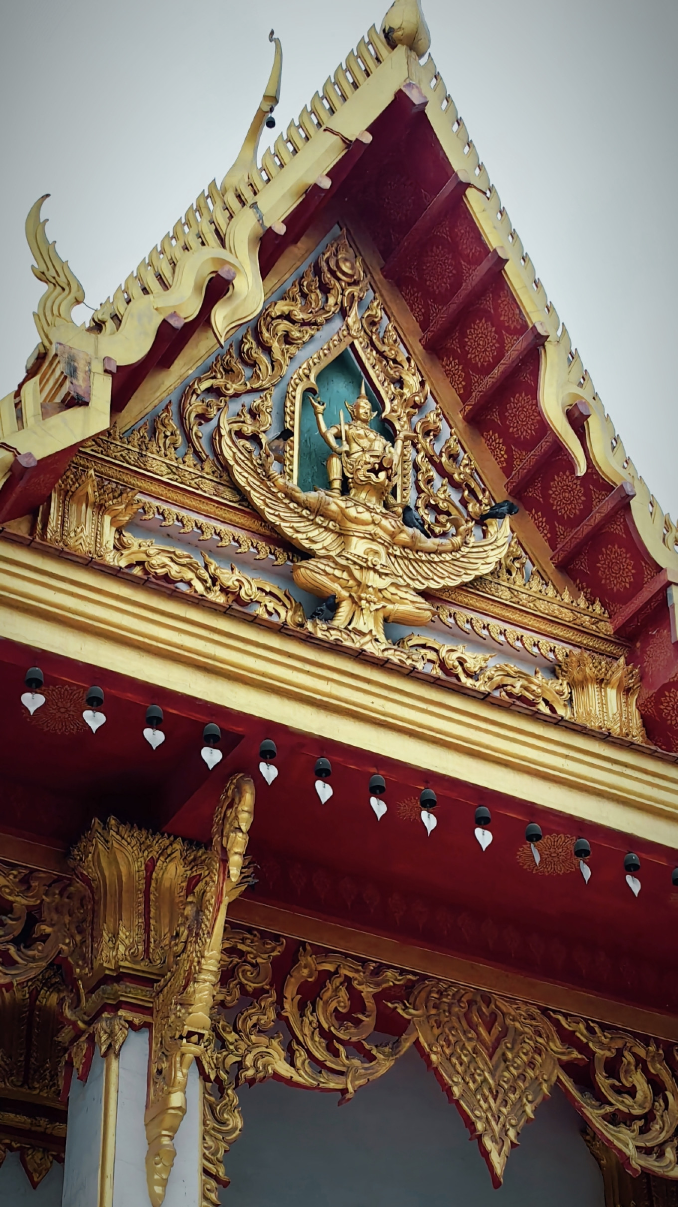以 曼谷 皇宮、金山寺為藍本,金頂紅檐,裝飾繁復的鎏金浮雕與神獸納迦雕像。