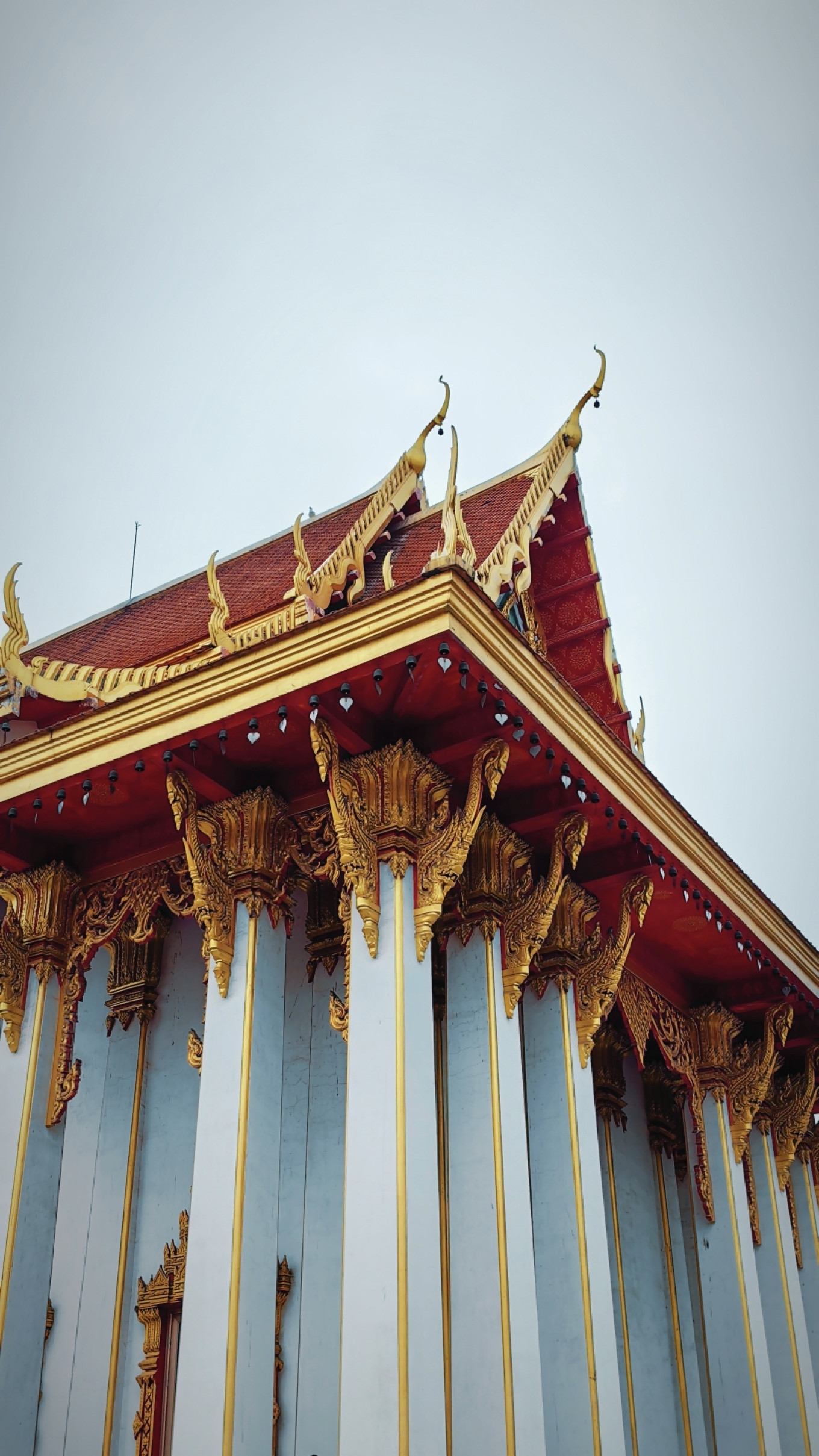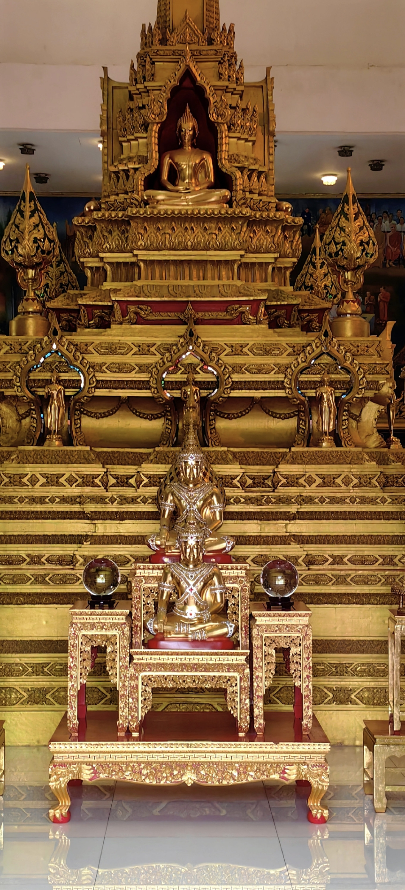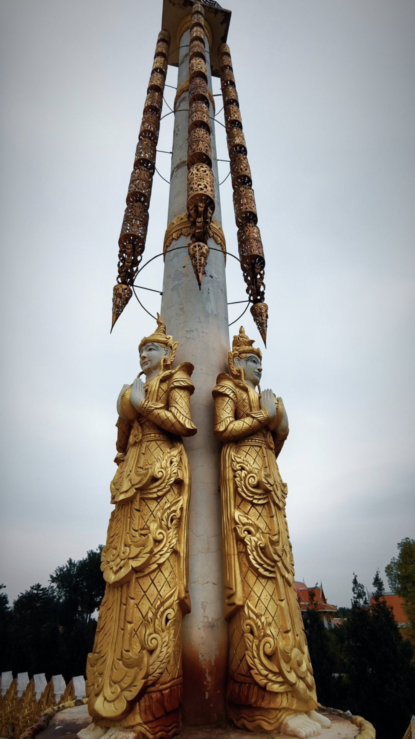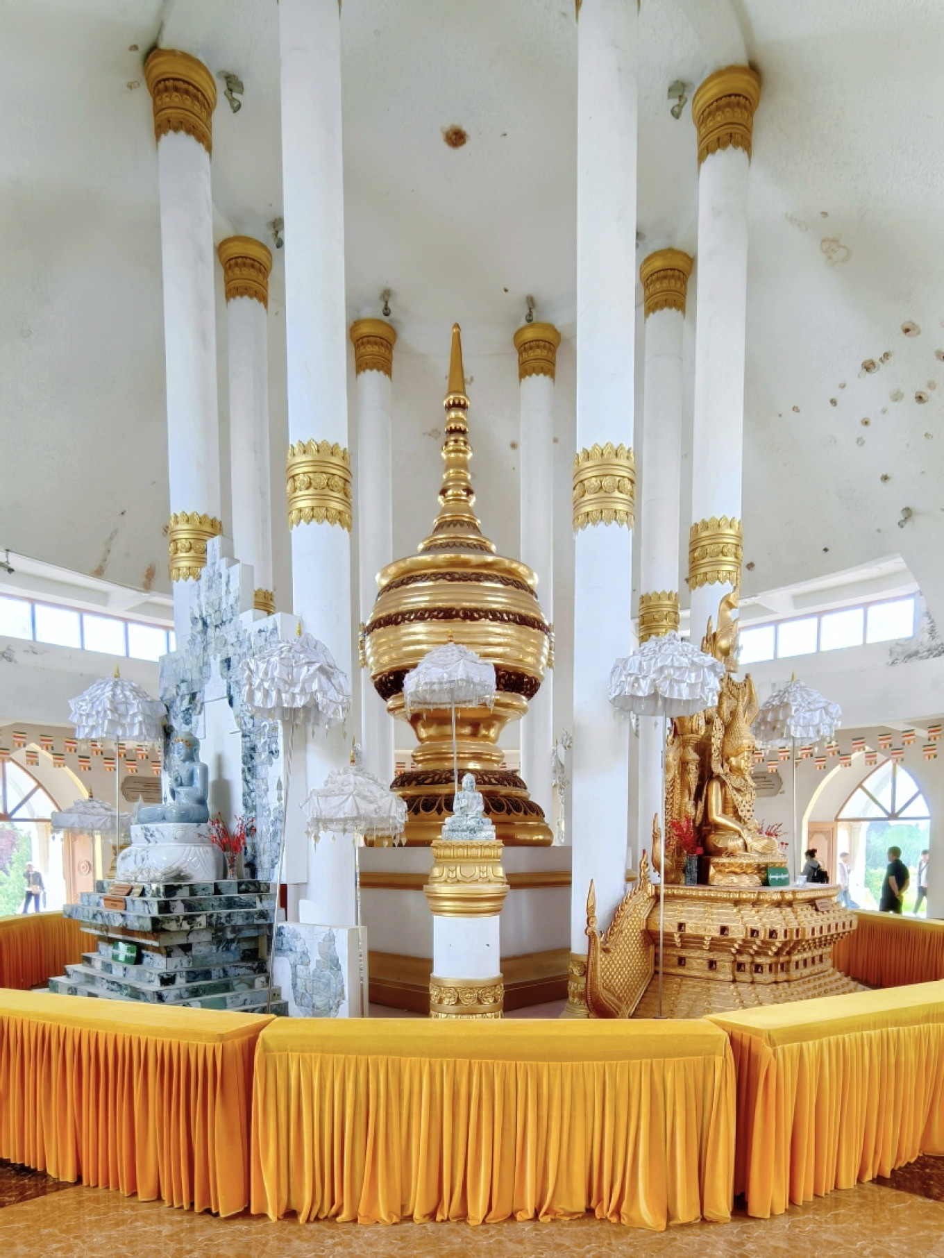 以 曼谷 皇宮、金山寺為藍本,金頂紅檐,裝飾繁復的鎏金浮雕與神獸納迦雕像。