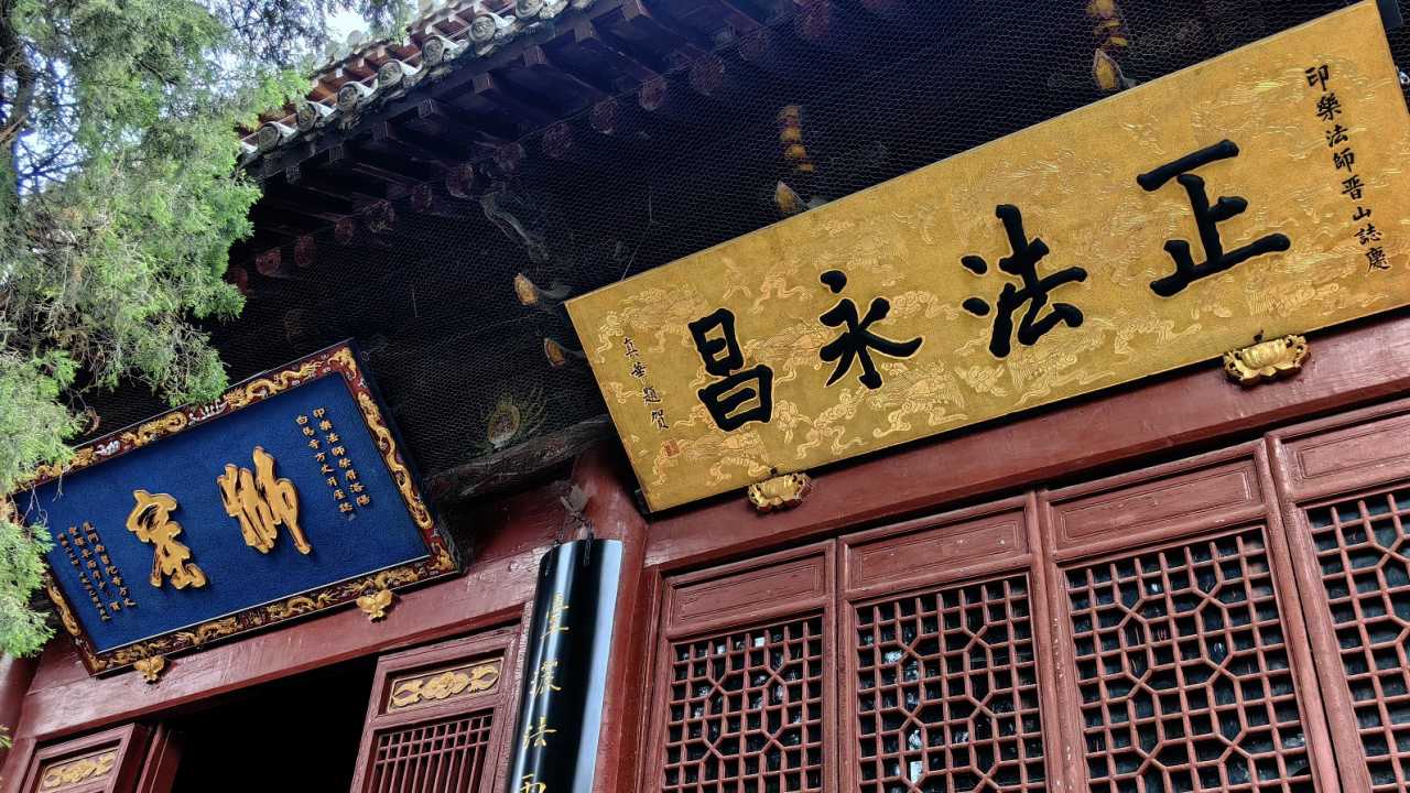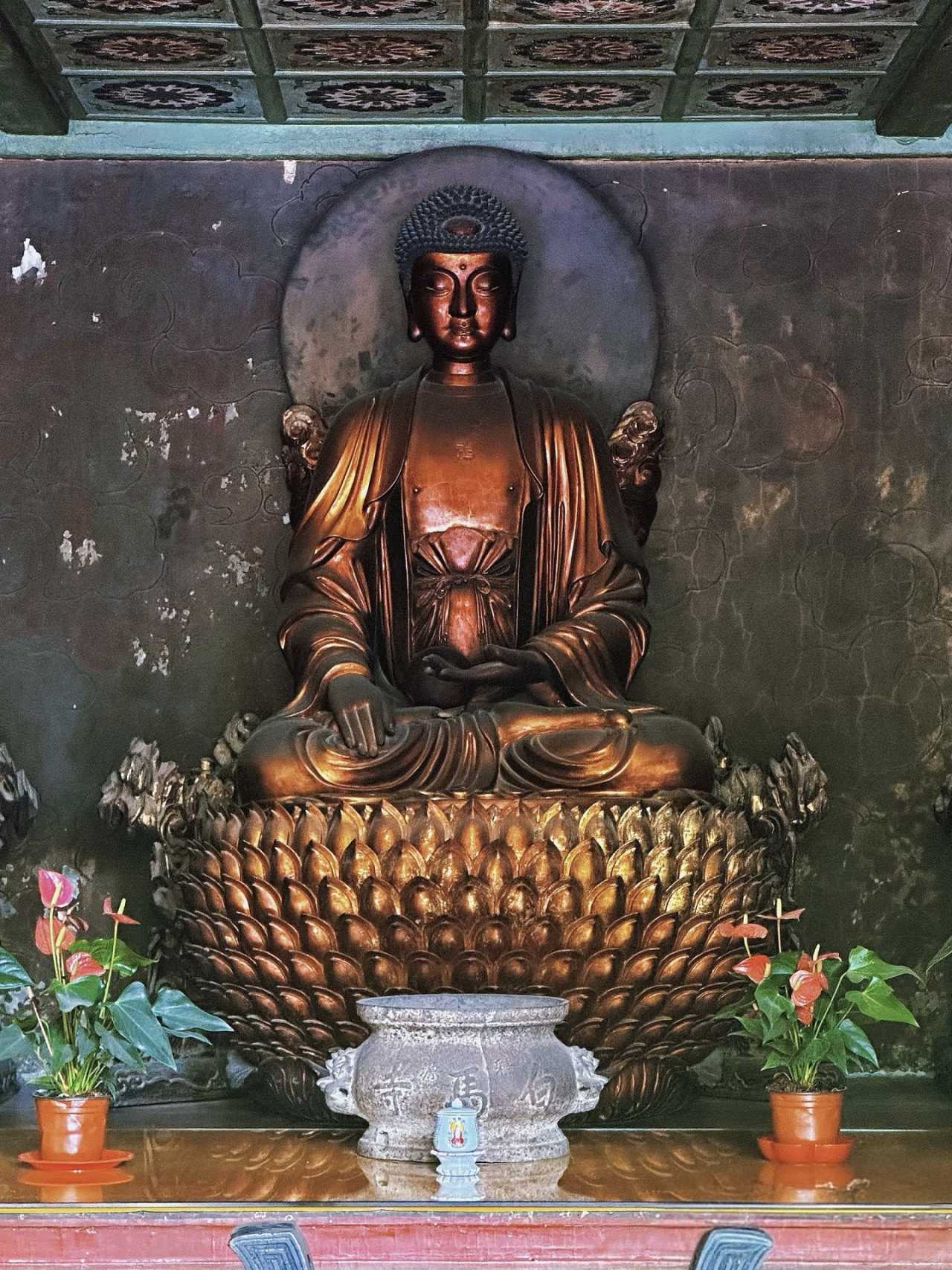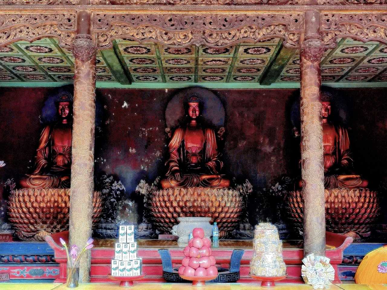 大雄殿深青色的琉璃瓦下,三世佛垂目俯瞰眾生。