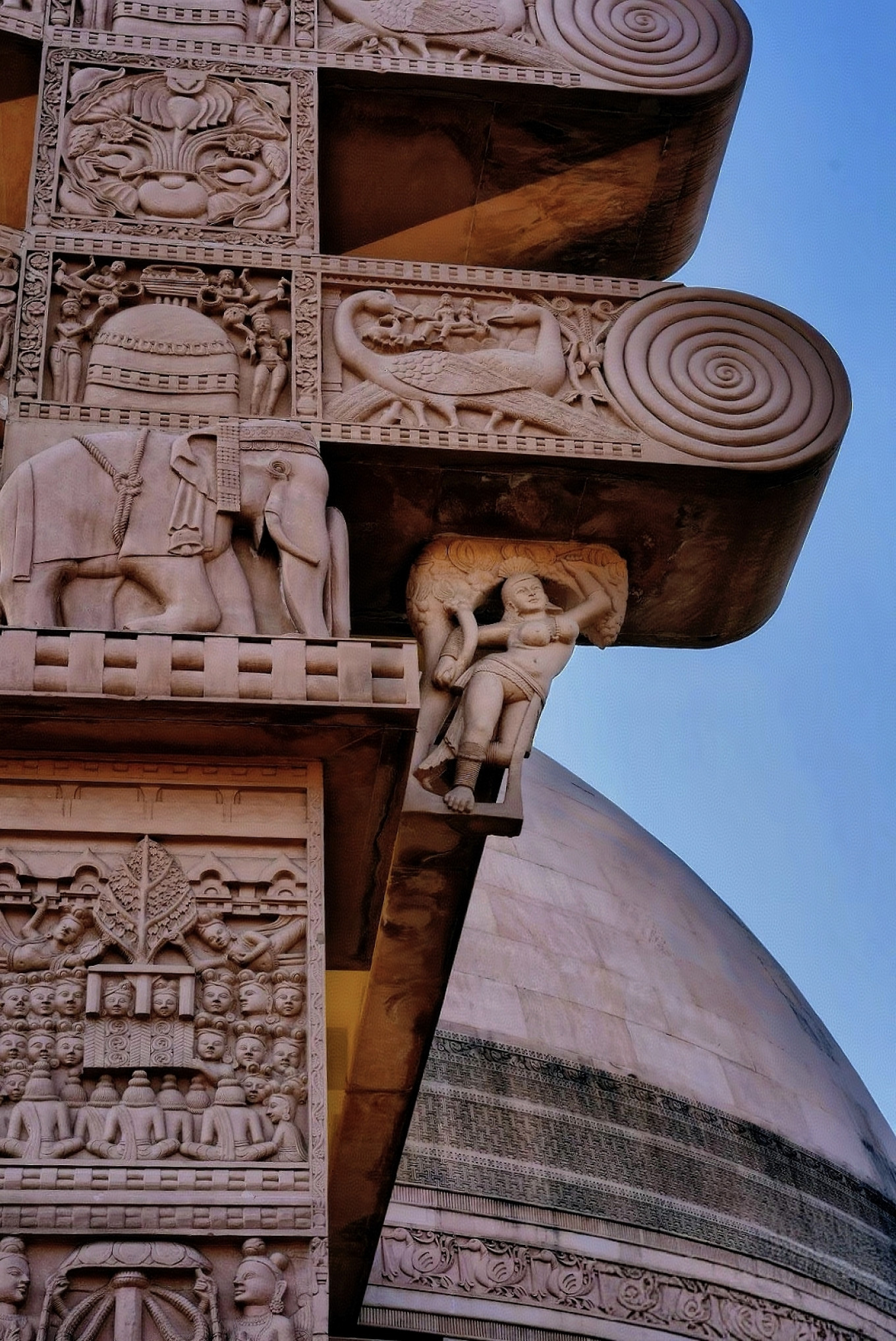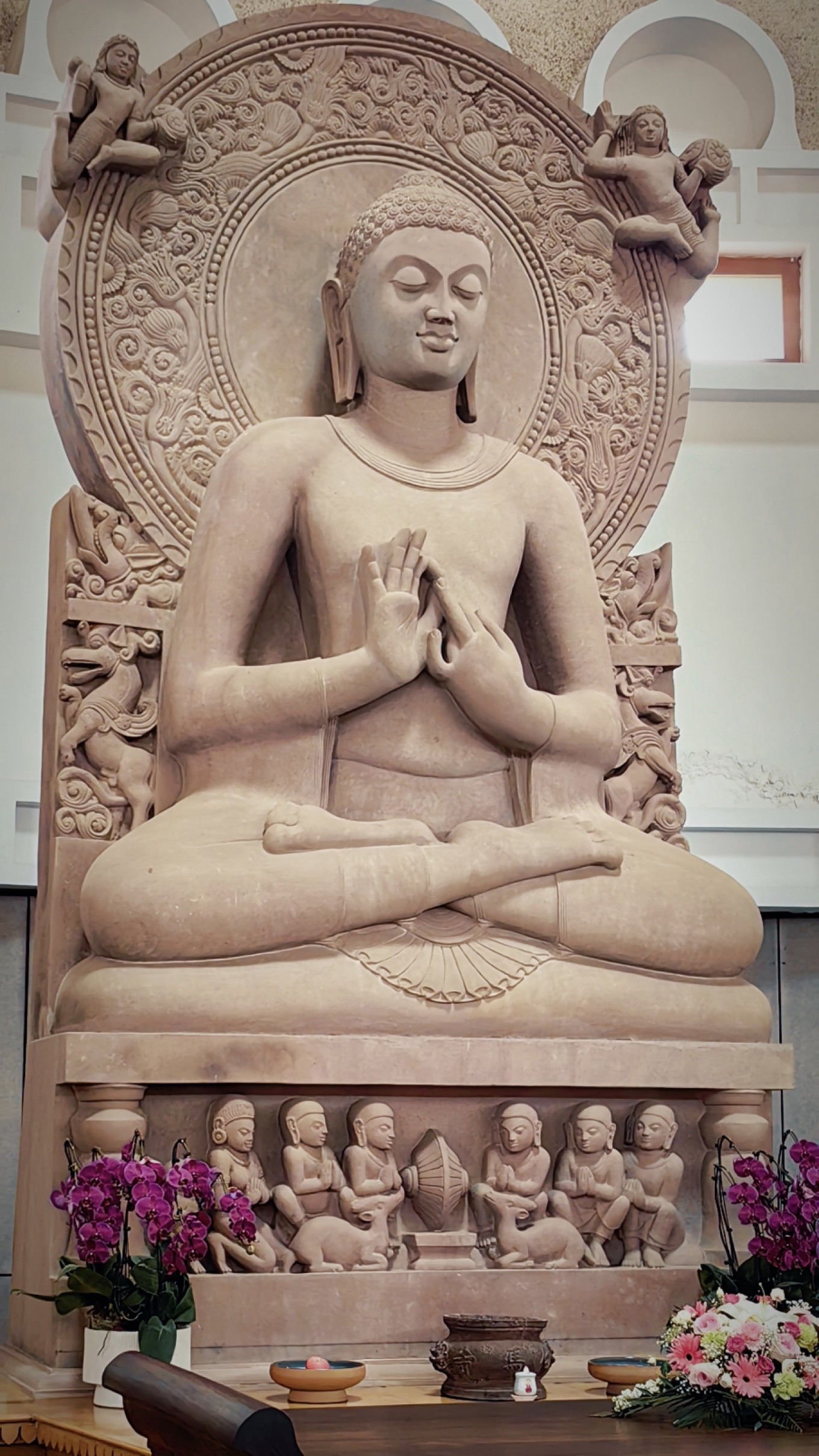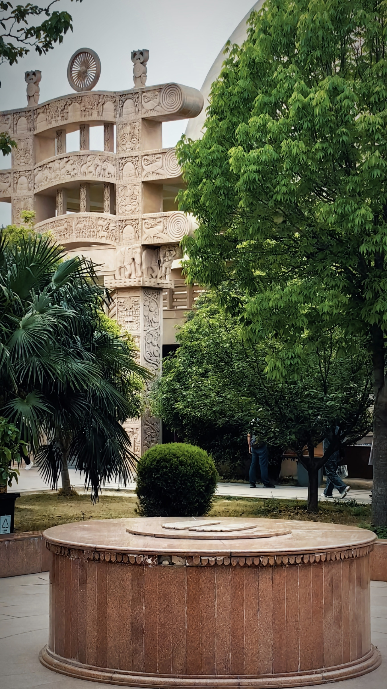 1:1仿 印度 桑奇大塔,覆缽式穹頂中央設玻璃天窗,陽光直射4.5米高佛陀說法像,營造佛光普照意境。