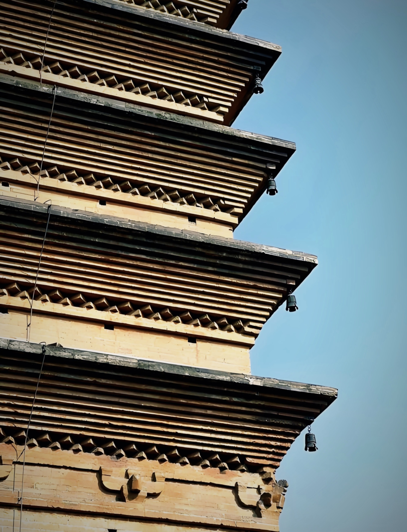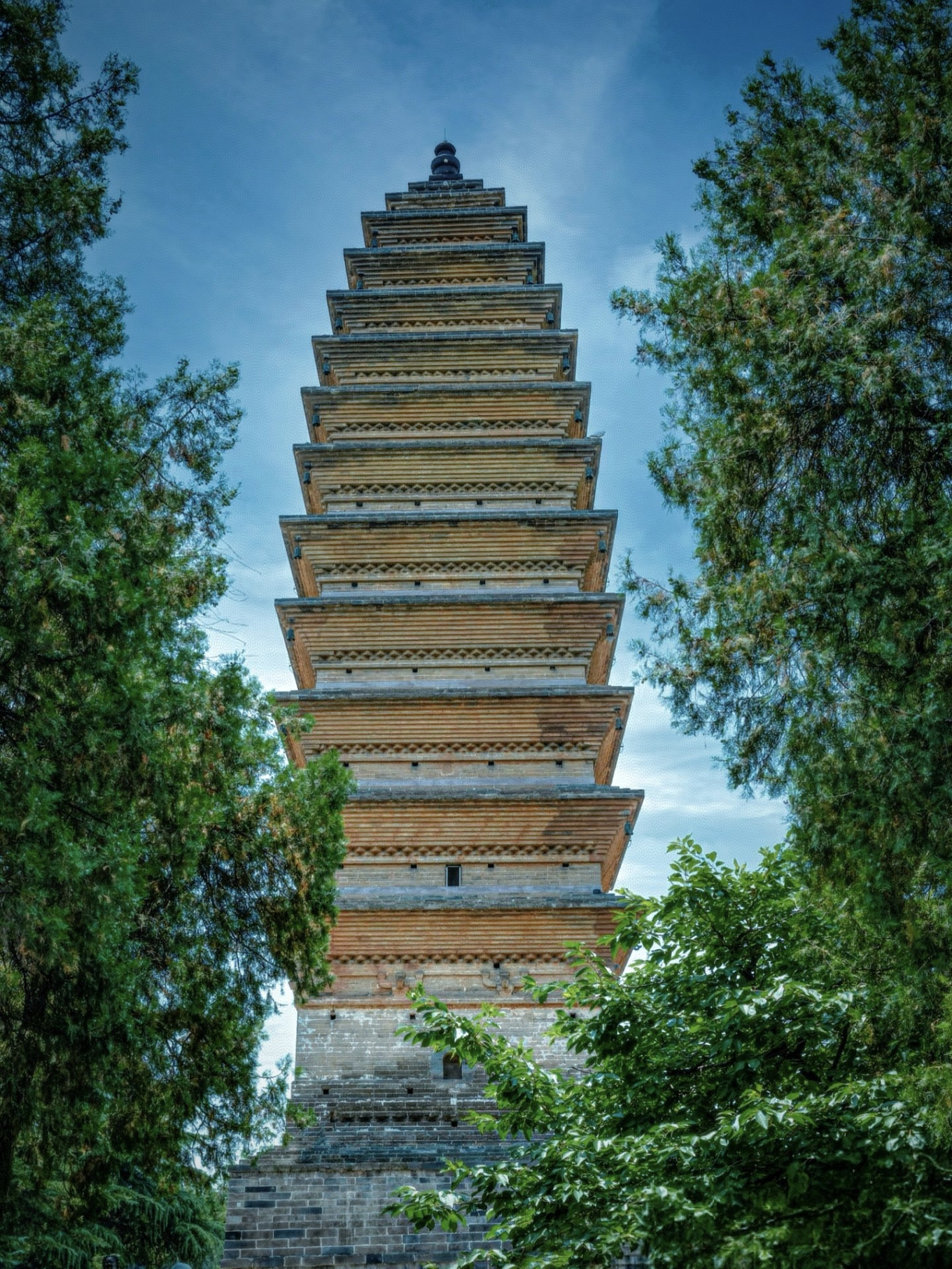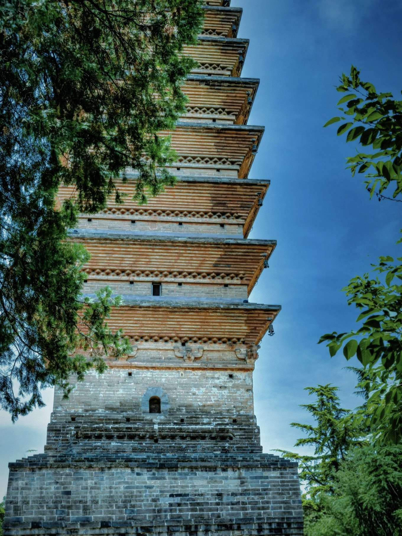 沿林徑東行半里,一座密檐磚塔刺破蒼穹。塔共13層,每層風鈴懸垂,是金代大定年間遺珍。繞塔三周后倚欄小憩,忽見群燕盤繞塔頂飛旋,塔鈴清越如天音洗耳。