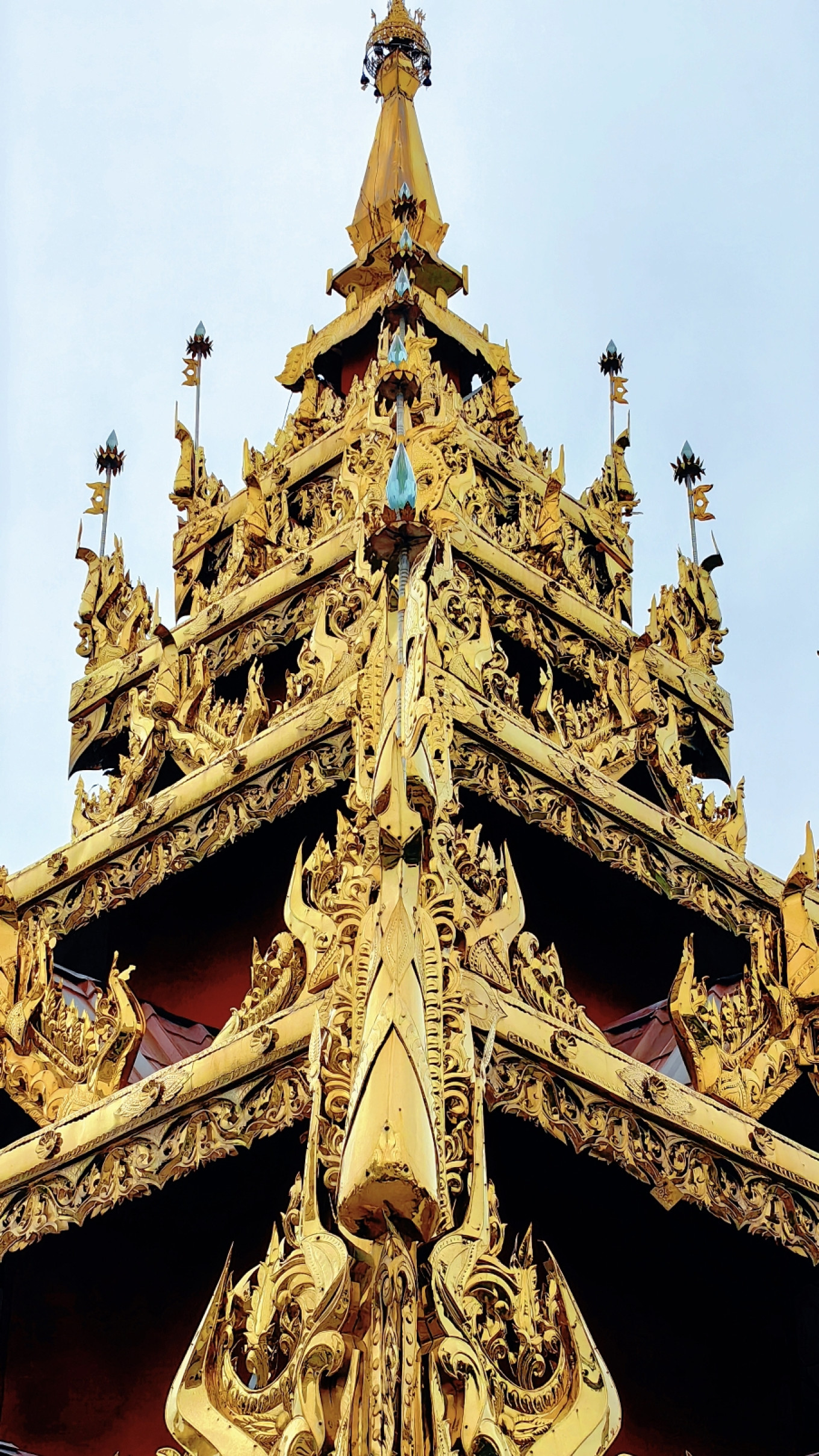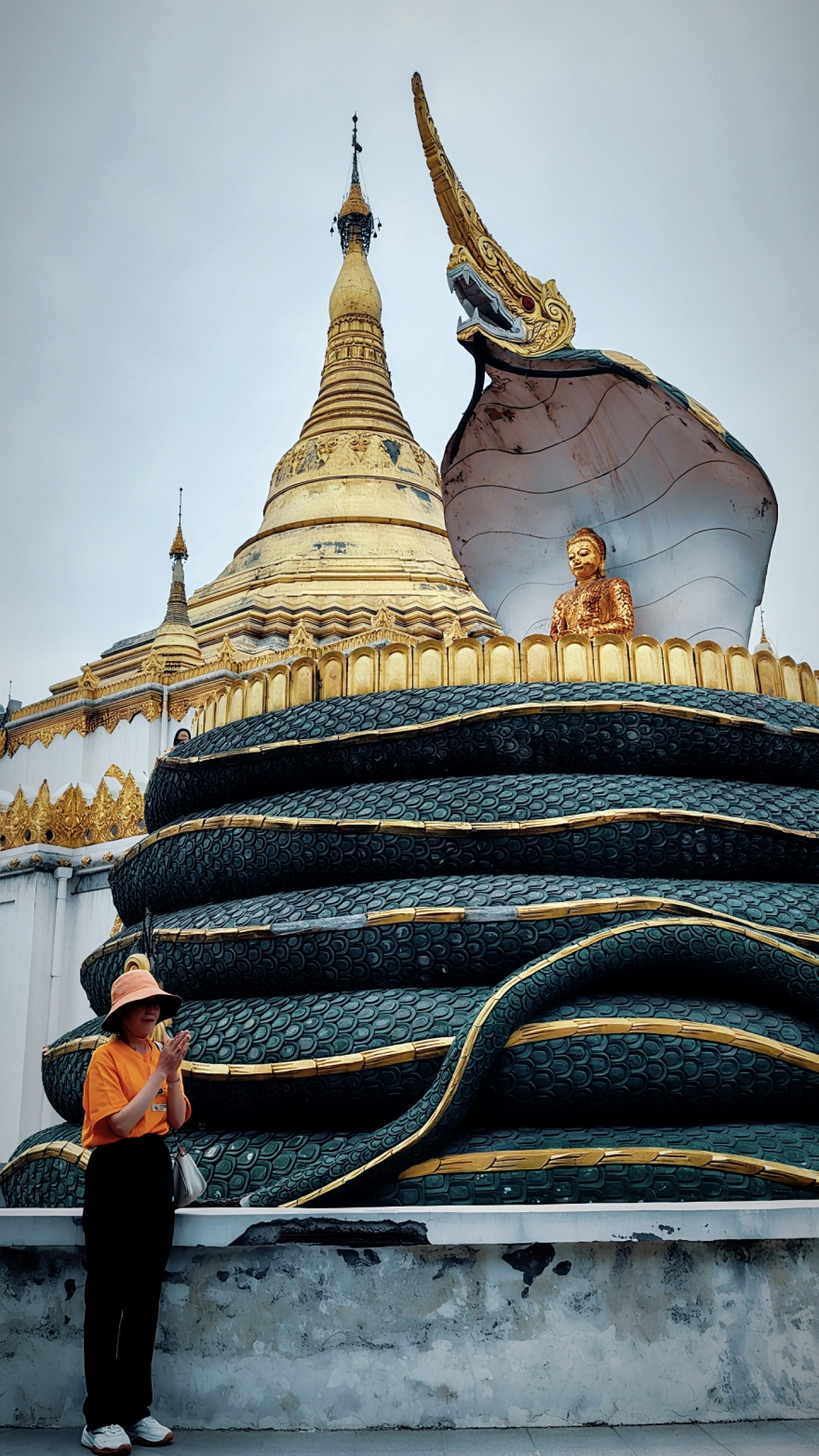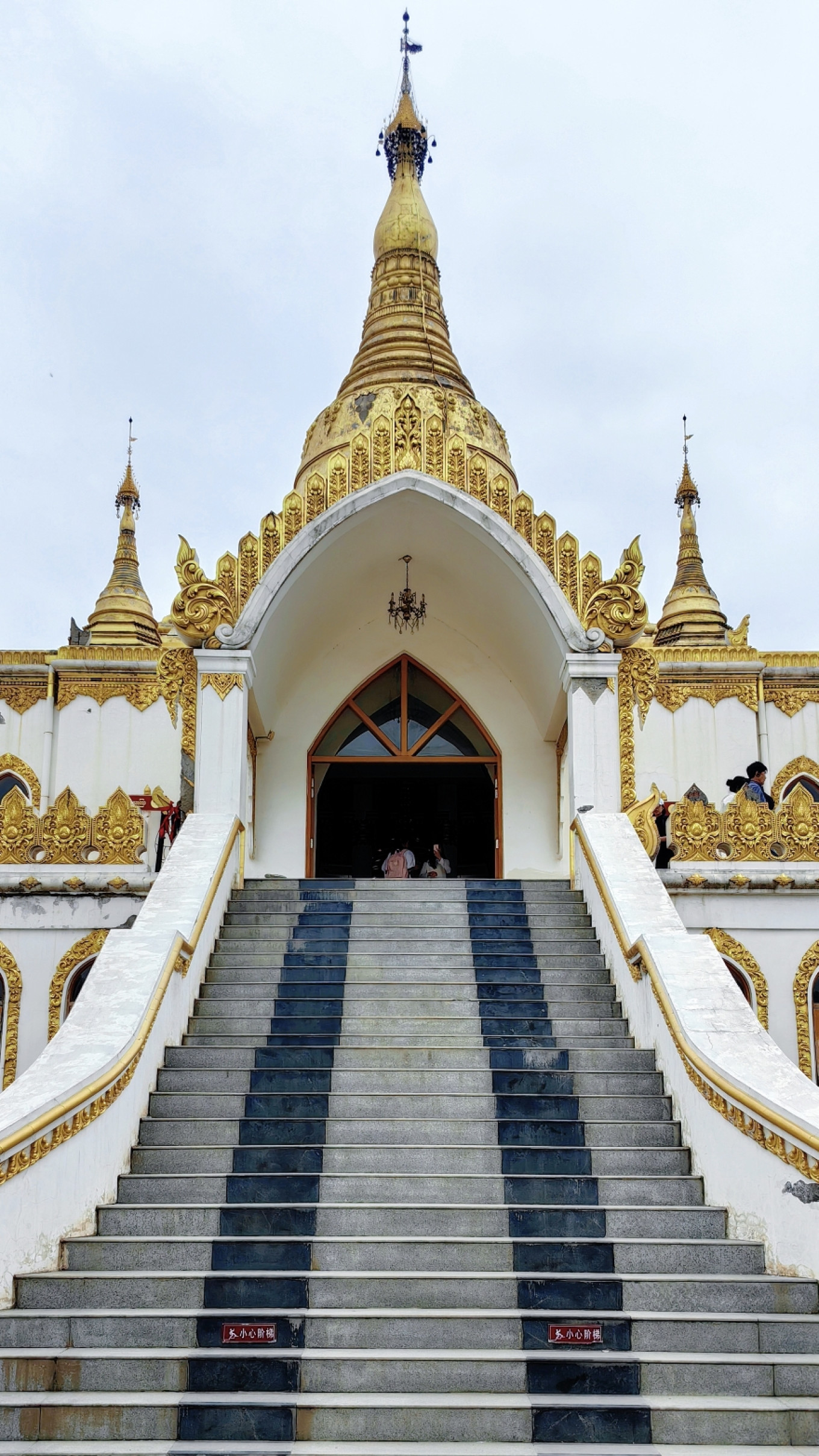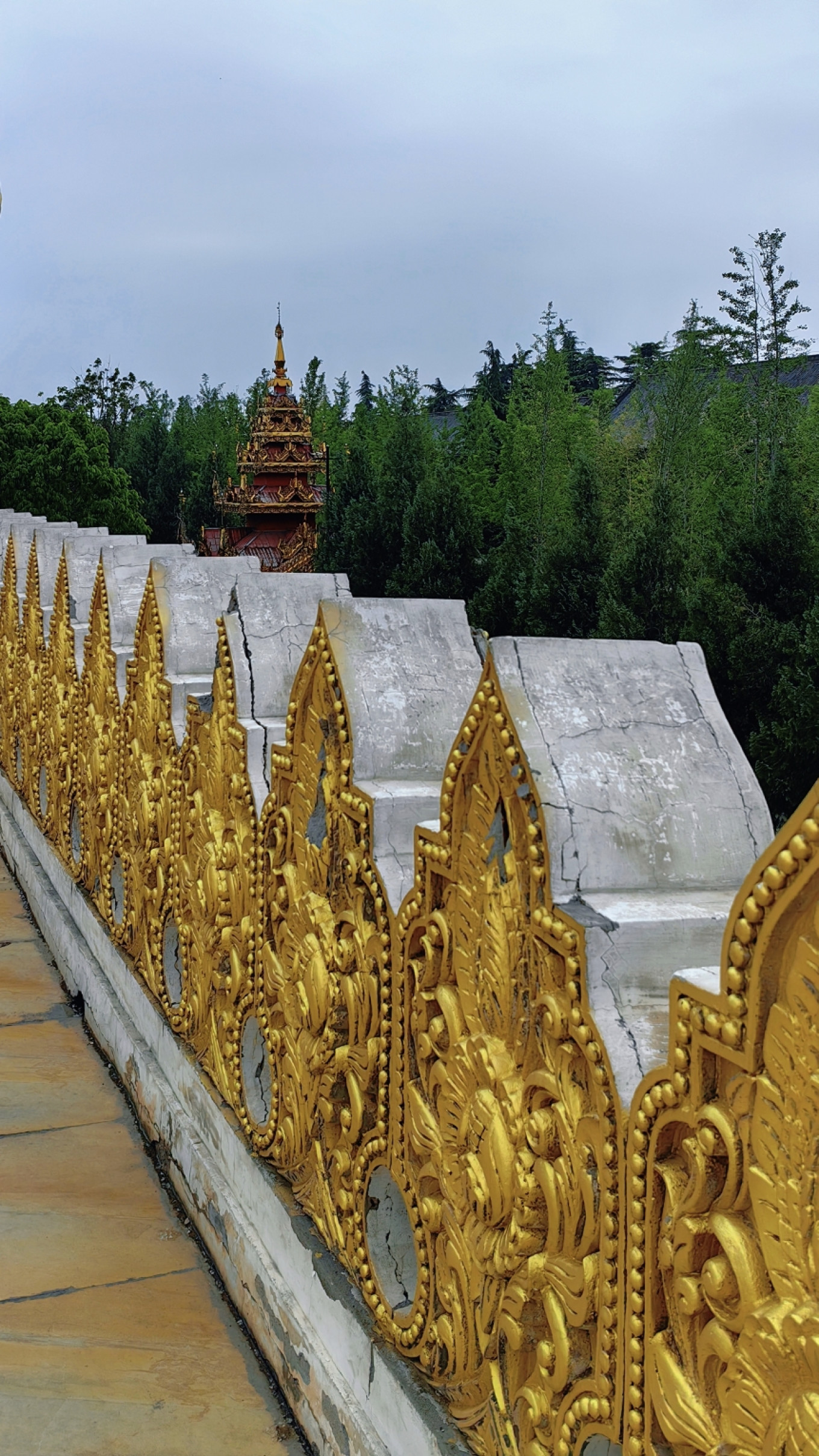 仿 仰光 大金塔等比縮小建造,32.9米高金塔通體貼金,塔頂鑲嵌寶石,風鈴隨風鳴響。