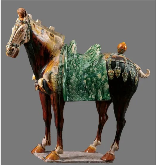 馬為棕紅色,膘肥體壯,預(yù)項高聳,神氣十足。馬鞍上濃綠色絨毯障泥垂至腹下。馬首轡飾齊全,馬頭飾鑣和綠色杏葉形垂飾。馬鬃被精心修剪出三縷堞垛狀鬃毛,是當(dāng)時來自西域的名貴馬種。