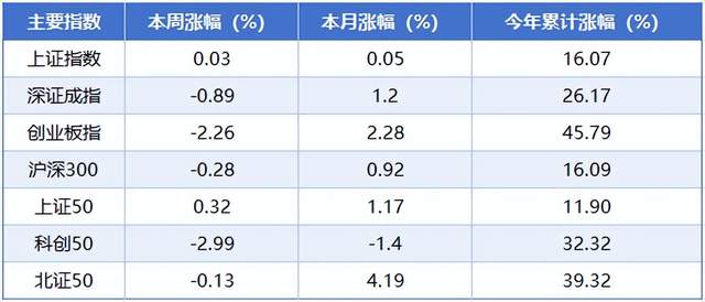 本周(12月15日至12月19日),A股三大指數漲跌互現。截至周五收盤,上證指數累計上漲0.03%,深證成指累計下跌0.89%,創業板指累計下跌2.26%。