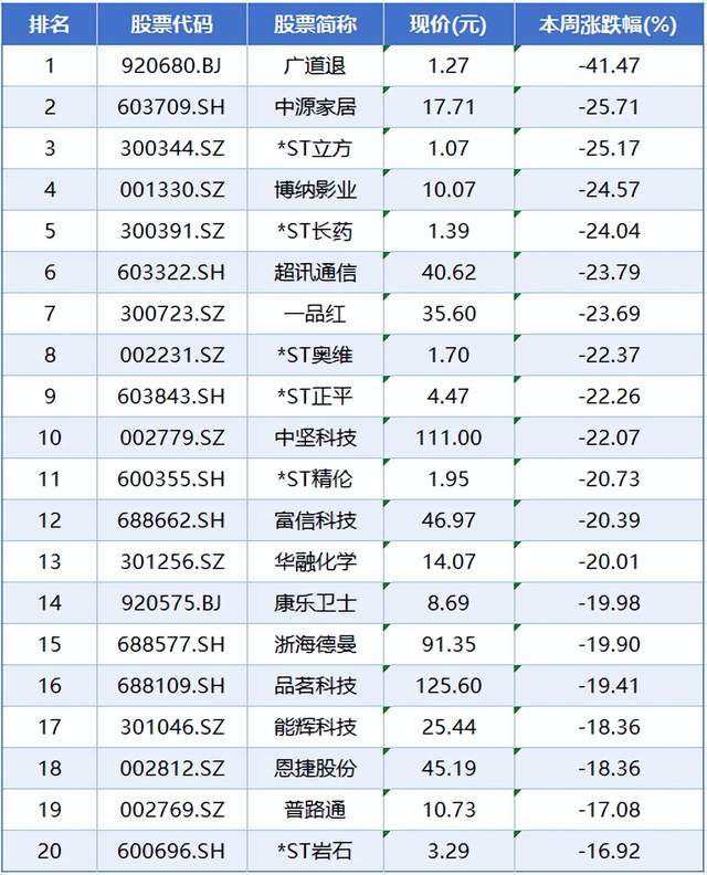 本周個股跌幅榜前五位分別是廣道退、中源家居、*ST立方、博納影業、*ST長藥,累計跌幅分別為41.47%、25.71%、25.17%、24.57%、24.04%。