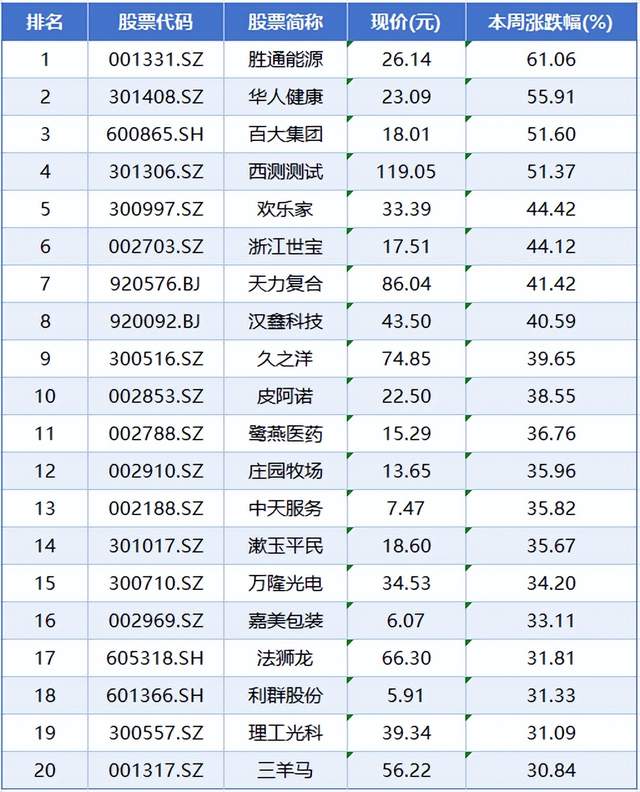 個股方面,本周個股漲幅榜前五位分別是勝通能源、華人健康、百大集團、西測測試、歡樂家,累計漲幅分別為61.06%、55.91%、51.60%、51.37%、44.42%。