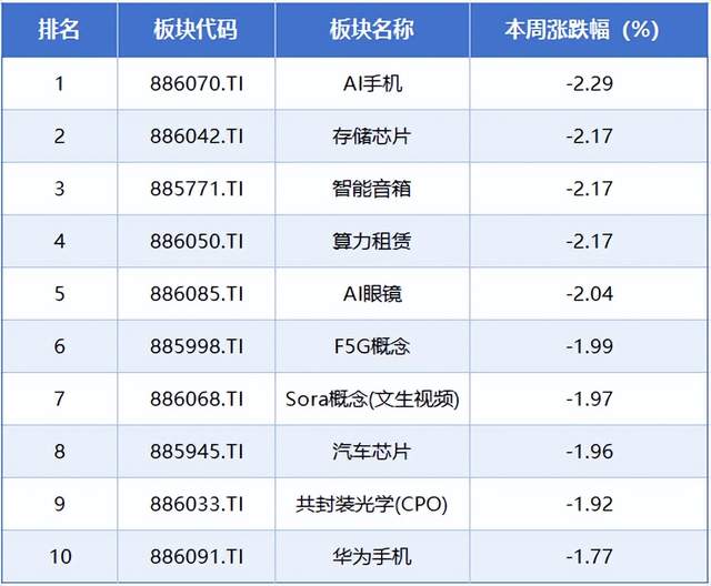 本周排在跌幅榜前排的概念板塊分別是AI手機、存儲芯片、智能音箱、算力租賃、AI眼鏡,累計跌幅分別為2.29%、2.17%、2.17%、2.17%、2.04%。