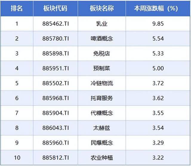板塊方面,本周漲幅居前的概念板塊分別是乳業、啤酒概念、免稅店、預制菜、冷鏈物流,累計漲幅分別為9.85%、5.54%、5.33%、5.00%、3.72%。