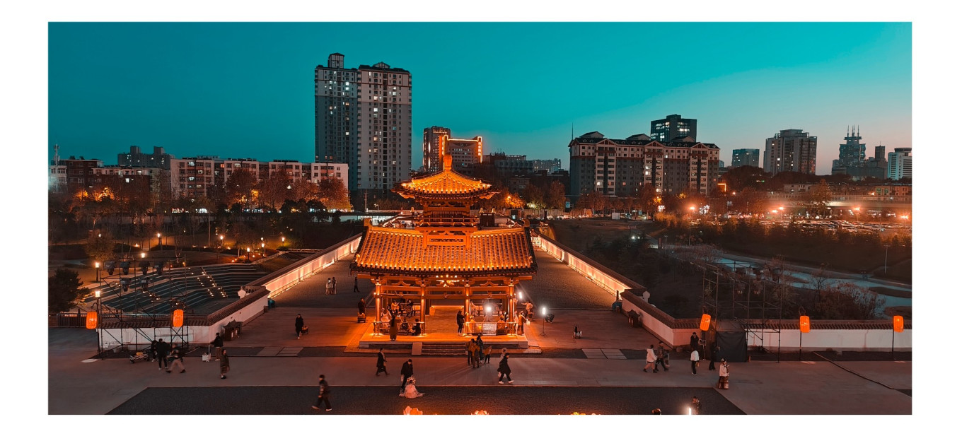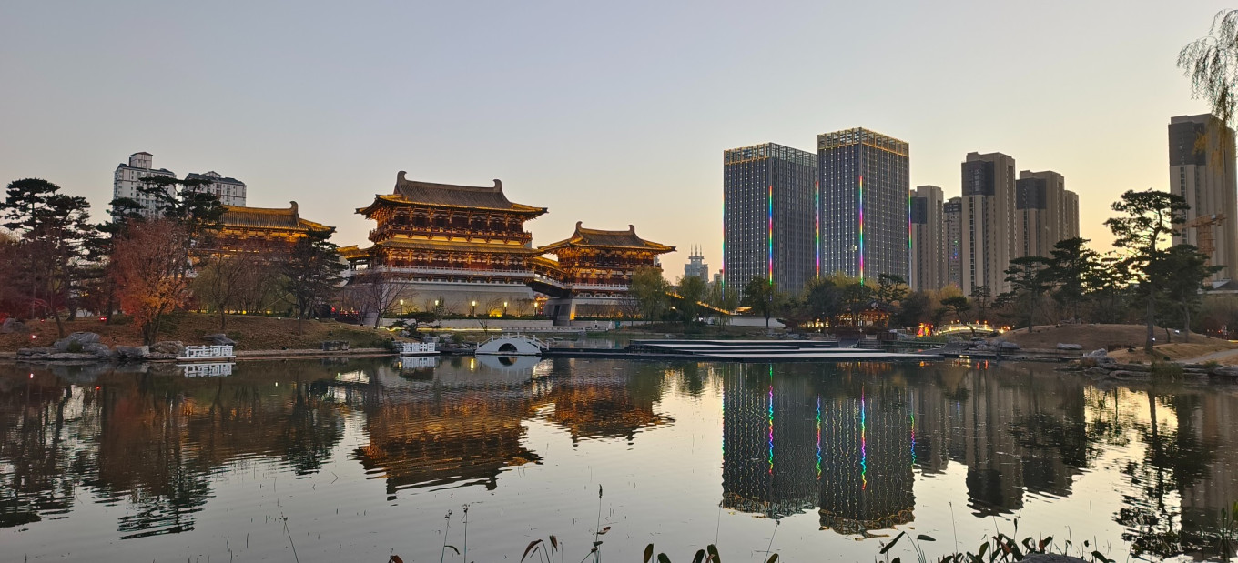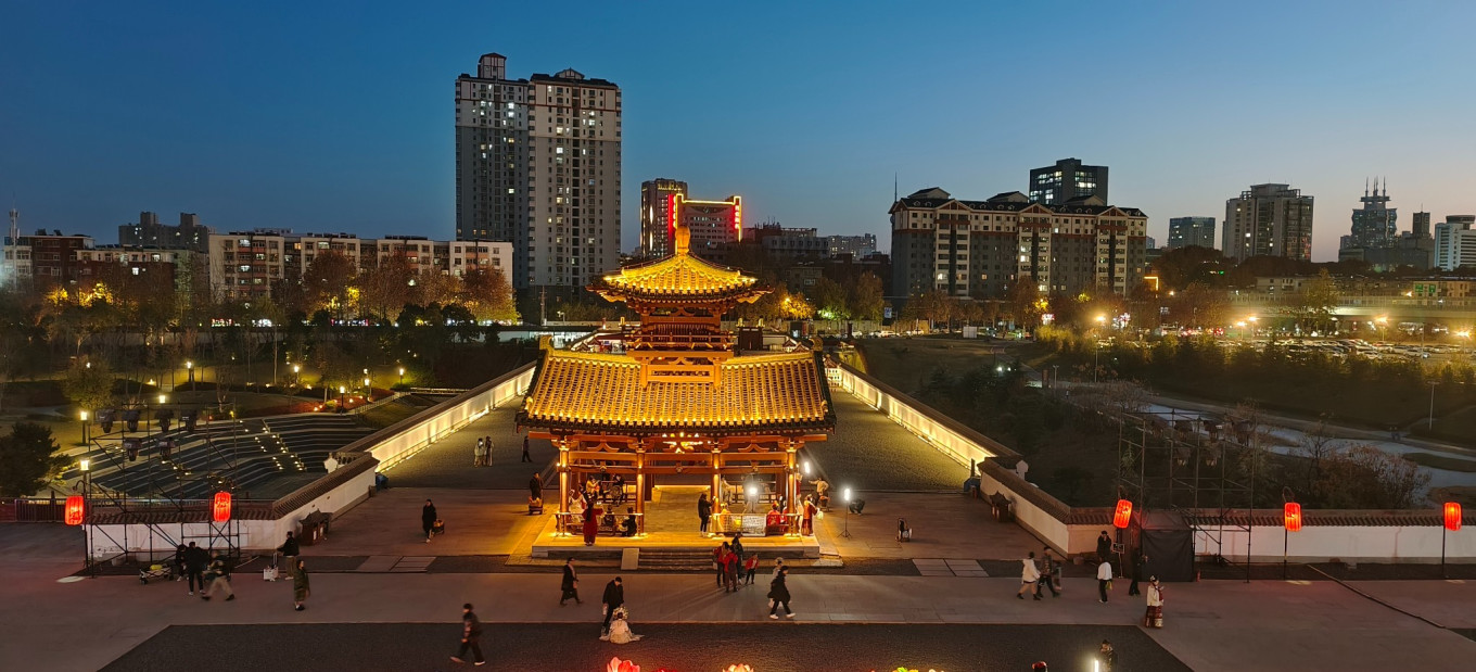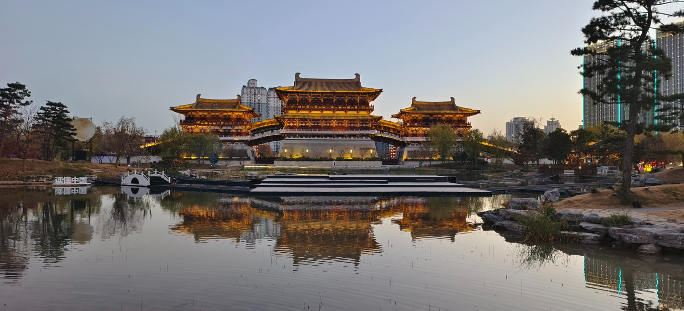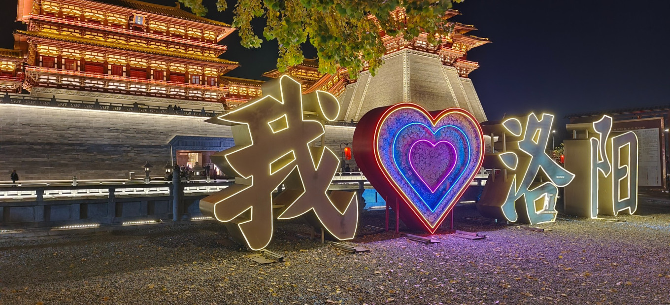 落日余暉,天逐漸暗了下來, 九州 池乃至整個 洛陽 古城區內的建筑即將迎來它們的高光時刻。