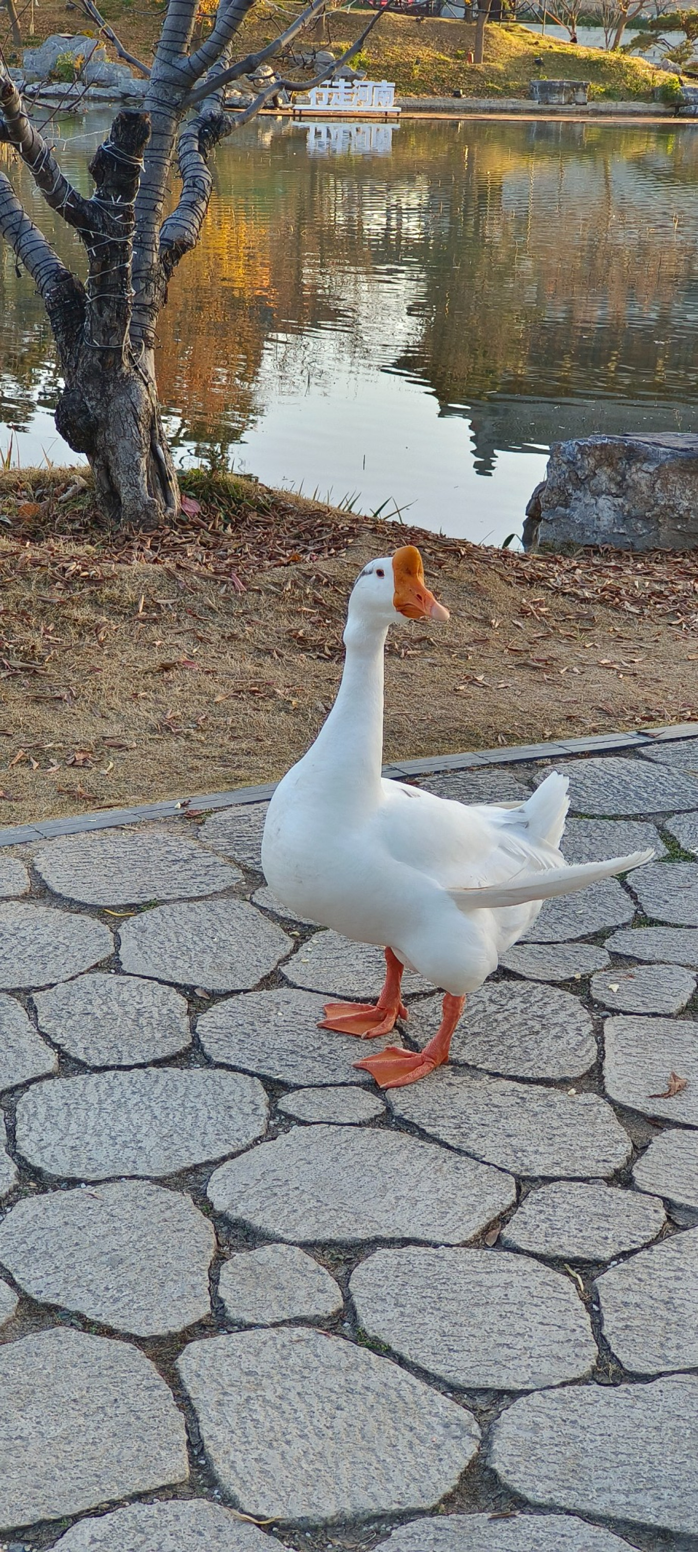 在 九州 池里遇到一只非常搞笑的大鵝,一位大媽喂了它一點食物,它就盯上那位大媽了,還盯著不放,大媽走到哪里它跟到哪里,很好玩。