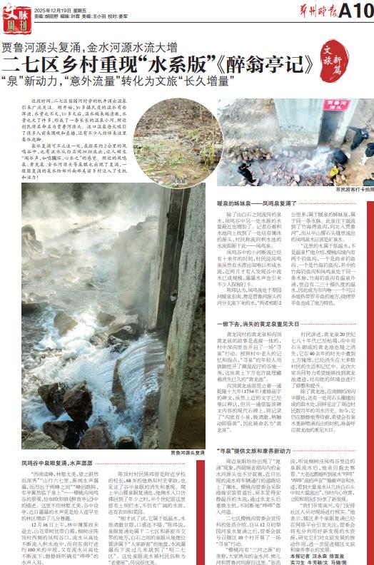 泉水復涌可不止這一處,在距其約2公里的鳳鳴谷中,也有流水從白石間汩汩流出,讓人頓生“聞水聲,如鳴珮環,心樂之”的感覺。附近的鳳鳴泉、黃龍泉、金水河源頭等泉眼也出現了復涌,一股股復涌的泉水給鄭州南部美麗鄉村注入了生機和活力!