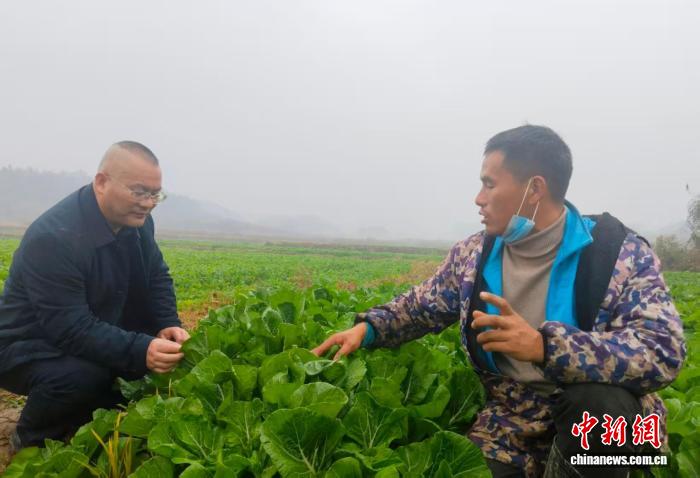 宋善民(右)與東安縣農業(yè)農村局農技人員查看蔬菜長勢。謝助民 攝