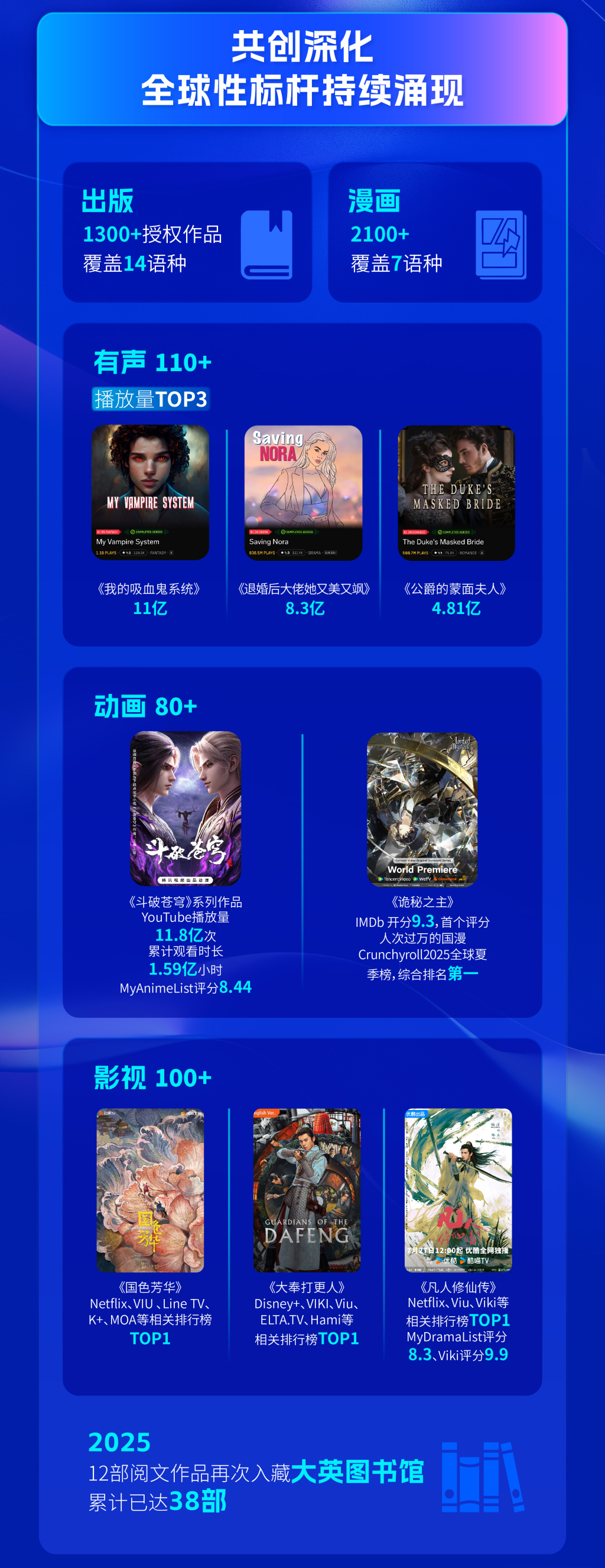 與此同時,中國IP產(chǎn)業(yè)模式也應用于海外,推動海外原創(chuàng)IP的產(chǎn)業(yè)鏈開發(fā)。以起點國際年度征文大賽(WSA)為例,歷屆獲獎作品中,超七成作品已進入IP開發(fā)。由往屆獲獎作品《我的吸血鬼系統(tǒng)》改編的有聲書播放量達11億、漫畫也已上線。2025年WebNovel及WSA還增設了“年度之書”“漫畫改編獎”等榮譽,獲獎作品可直通漫畫、有聲及短劇等多元改編。