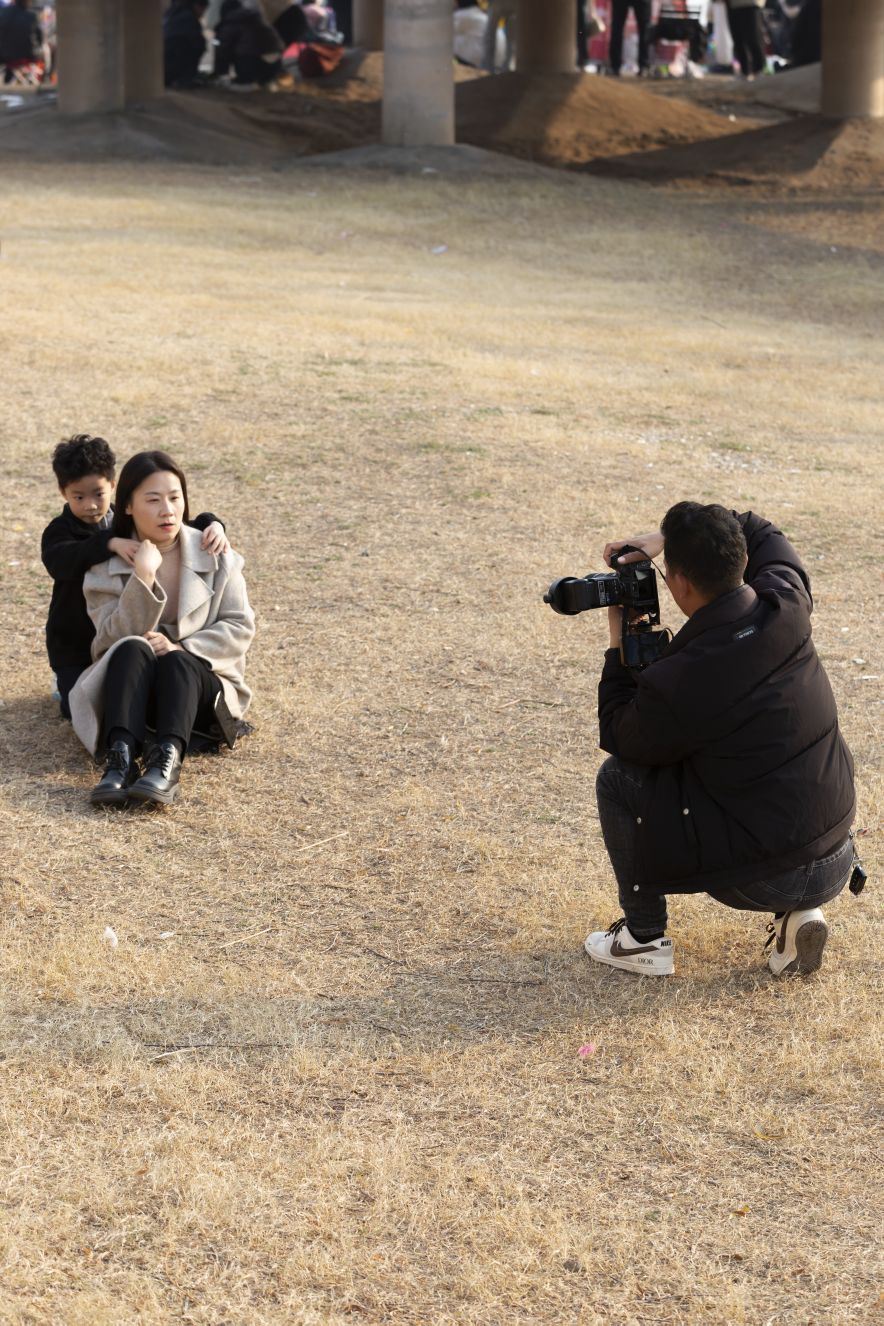 相機的快門聲在湖畔此起彼伏。攝影師們蹲在枯黃的草地上,舉著鏡頭捕捉紅嘴鷗掠過水面的瞬間,也為前來打卡的游客定格溫馨時刻。一位攝影師半跪著,為母子倆拍下與紅嘴鷗同框的畫面,拍完后笑著遞過照片,游客接過的不僅是一張相片,更是白龜湖的冬日記憶。而這些相機,也成了攝影師們創收的“利器”,在紅嘴鷗翩飛的季節里,按下快門就是收獲。