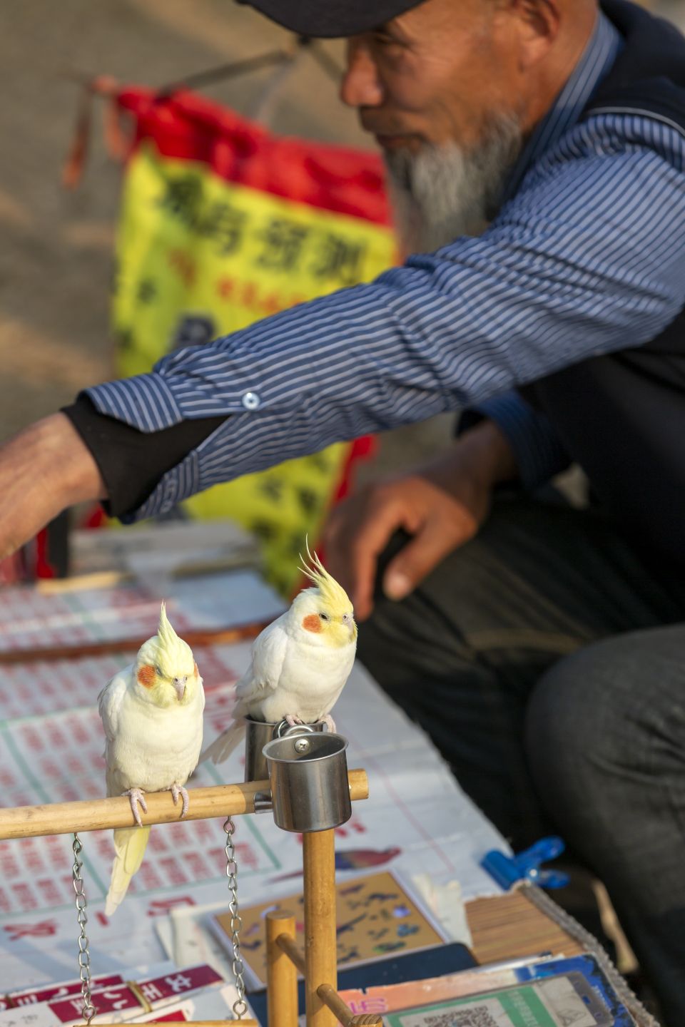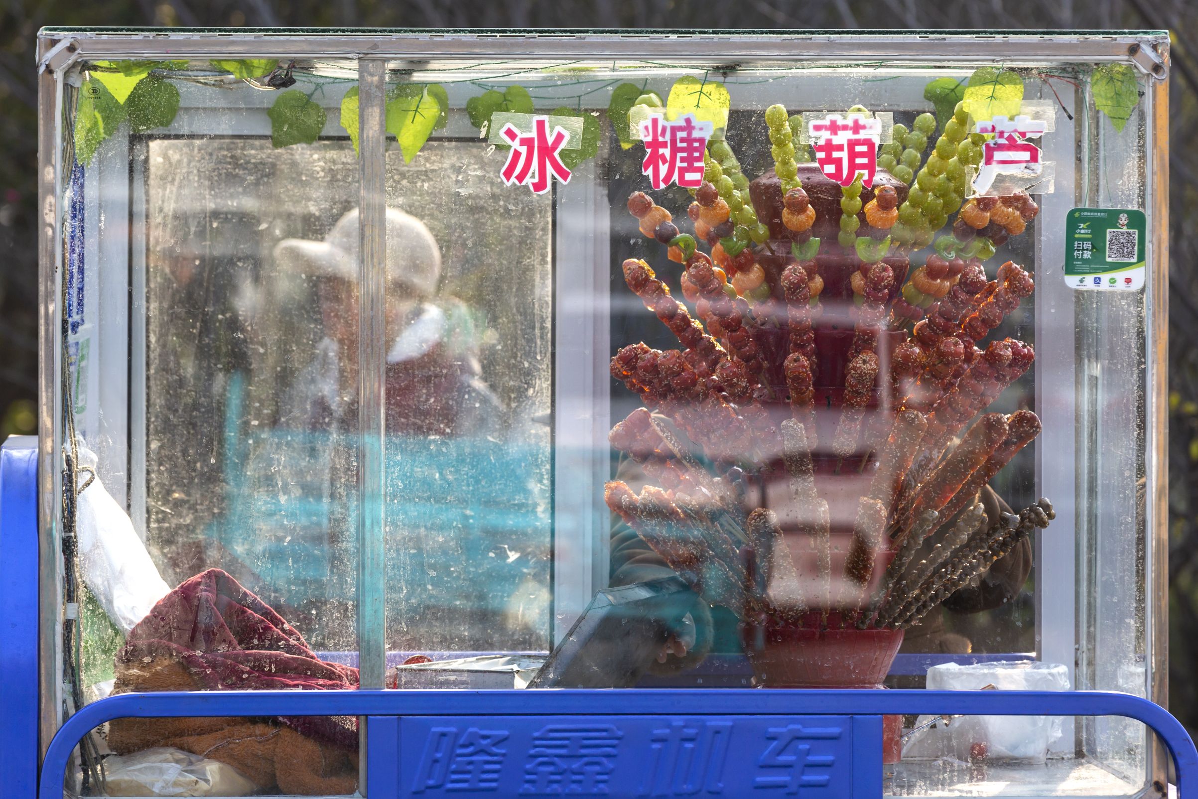 沿著湖岸走,糖葫蘆的甜香混著烤香腸的焦香撲面而來。玻璃柜里的冰糖葫蘆裹著晶瑩的糖衣,像一串串紅色的瑪瑙,孩子們拽著家長的衣角,指著七彩的氣球和酸甜的糖葫蘆,攤販們手腳麻利地遞貨,零錢在鐵盒里叮當作響。不遠處,一對鸚鵡站在木架上,對著來往的游人學舌,主人靠著這只會說話的鳥兒招攬游客,小小的攤位前總圍著看熱鬧的人,硬幣投進鐵盒的聲響,也是紅嘴鷗經濟里生動的音符。