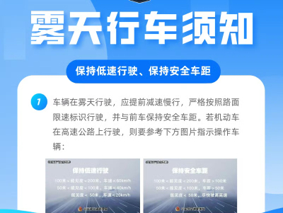 霧中行車時,要嚴格遵守規定限速行駛,千萬不可開快車。霧越大,可視距離越短,車速就要求越低。遇濃霧能見度小于50米時,車速不得超過每小時20公里。