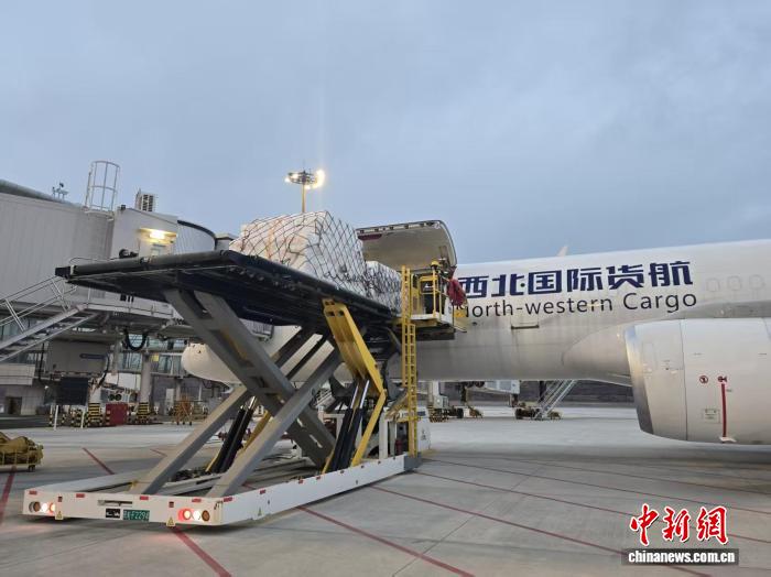 圖為裝箱凍鱒魚搭乘飛機出口。青海機場公司 供圖
