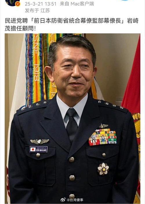 巖崎茂何許人也?出生于1953年2月3日,1971年從巖手縣立盛岡第三高等學(xué)??既敕佬l(wèi)大學(xué),1975年畢業(yè)后入職航空自衛(wèi)隊(duì),歷任航空總隊(duì)司令官、航空幕僚長(zhǎng)、統(tǒng)合幕僚長(zhǎng),2025年3月,72歲的巖崎茂接受臺(tái)當(dāng)局邀請(qǐng),擔(dān)任所謂的“行政院政務(wù)顧問(wèn)”,指導(dǎo)偽臺(tái)軍的軍備建設(shè)與作戰(zhàn)訓(xùn)練。