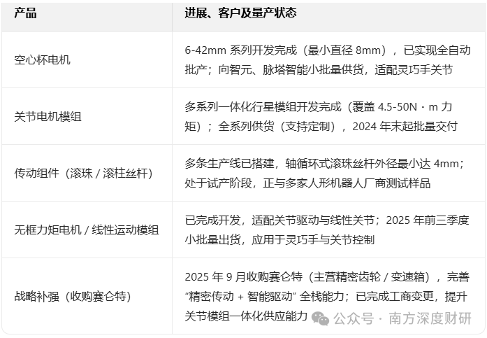 在機器人賽道,鼎智科技布局較早,2021年前便已開展技術儲備,當時核心產品線性執行器、混合式步進電機已可應用于工業機器人場景。2022年,公司推出空心杯電機并實現批產;2023年6月設立子公司專攻絲桿研發生產。目前,公司在機器人領域的產品矩陣已覆蓋線性執行器、旋轉執行器、靈巧手關鍵零部件,包括空心杯電機、無框力矩電機、精密減速箱、行星滾柱絲桿、精密驅控器等。據披露,2025年三季度電機及模組已實現小批量出貨,絲杠產品已可作為存貨對外銷售,空心杯電機、精密減速箱等仍處于送樣驗證階段。