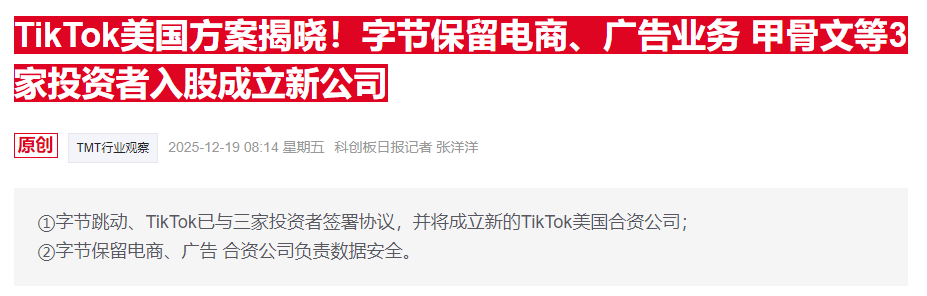 TikTok美國方案終于靴子落地。當?shù)貢r間12月18日,TikTok CEO周受資發(fā)出內(nèi)部信,更新了TikTok美國業(yè)務進展。內(nèi)部信稱字節(jié)跳動、TikTok已與三家投資者簽署協(xié)議,并將成立新的TikTok美國合資公司。