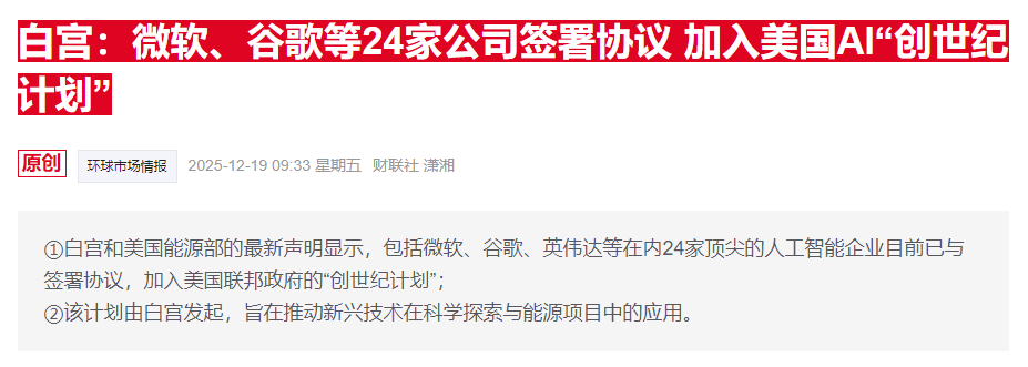 白宮和美國能源部的最新聲明顯示,包括微軟、谷歌、英偉達等在內(nèi)24家頂尖的人工智能企業(yè)已與美國政府簽署協(xié)議,加入“創(chuàng)世紀計劃”。該計劃由白宮發(fā)起,旨在推動新興技術在科學探索與能源項目中的應用。